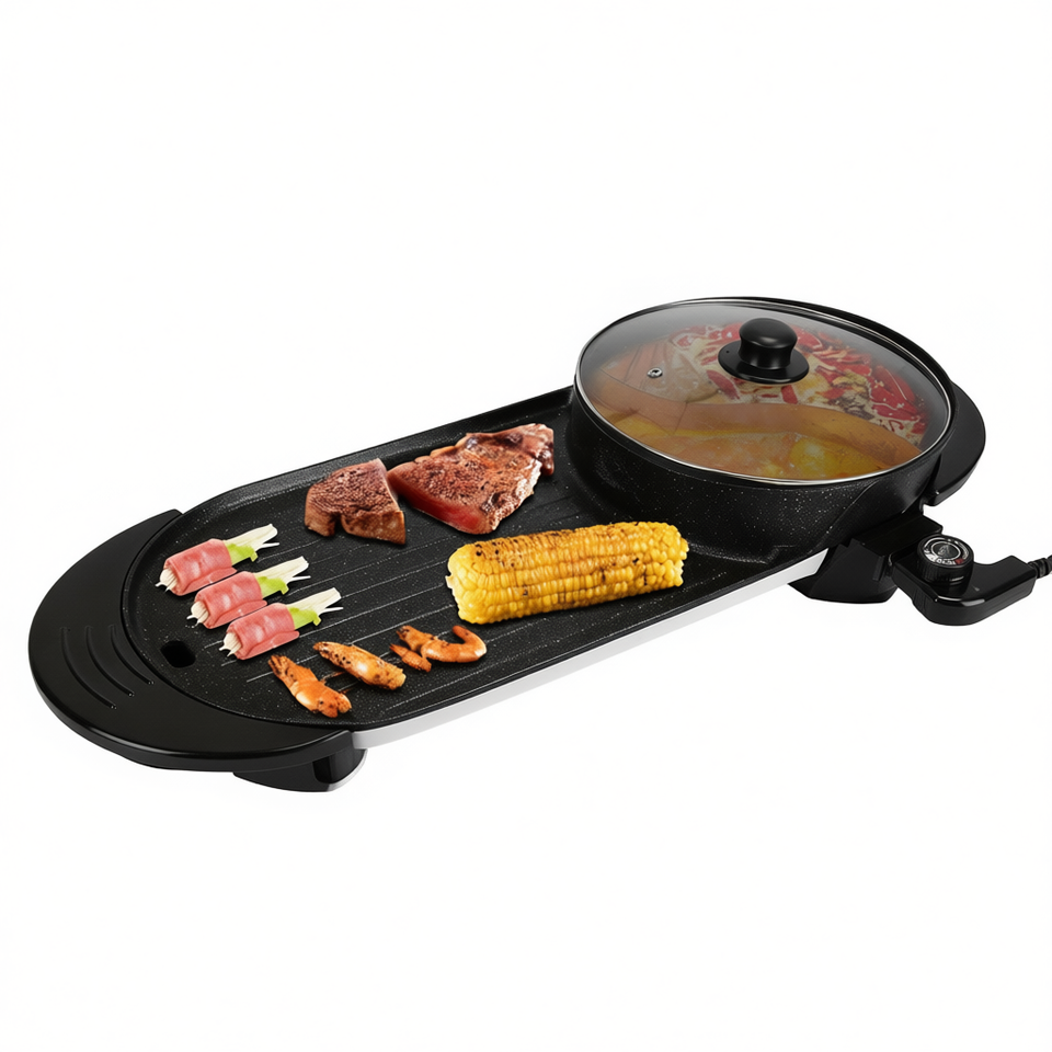 Pentola Elettrica Multifunzione con Griglia BBQ 2200W, Senza Fumo, Antiaderente, Controllo Temperatura Indipendente, 5 Livelli di Potenza, 2-10 Nero