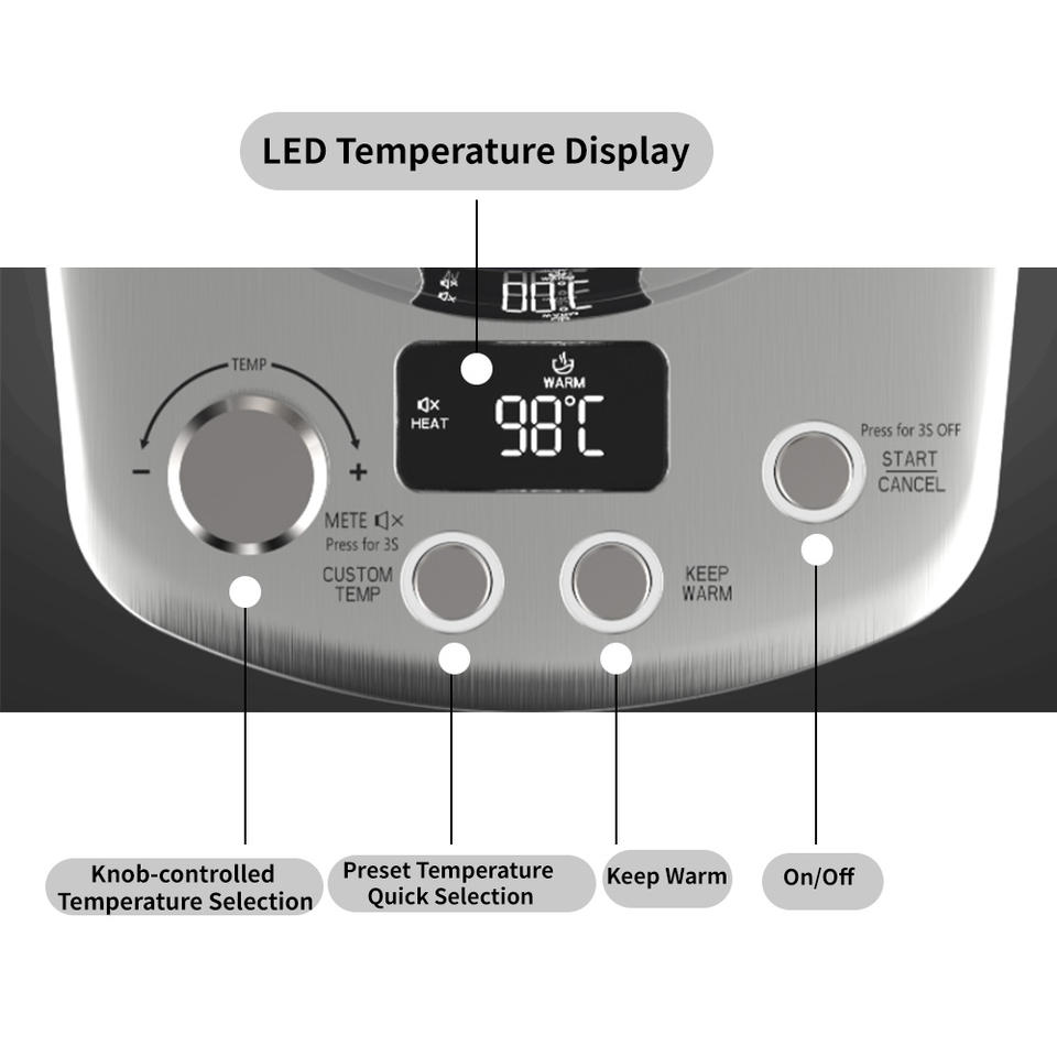 Una base di rotazione da 360 gradi, Senza fili, Keep Warm, Controllo della temperatura, Bollire-Protezione A Secco, Multi-Controllo della temperatura, Elemento riscaldante nascosto