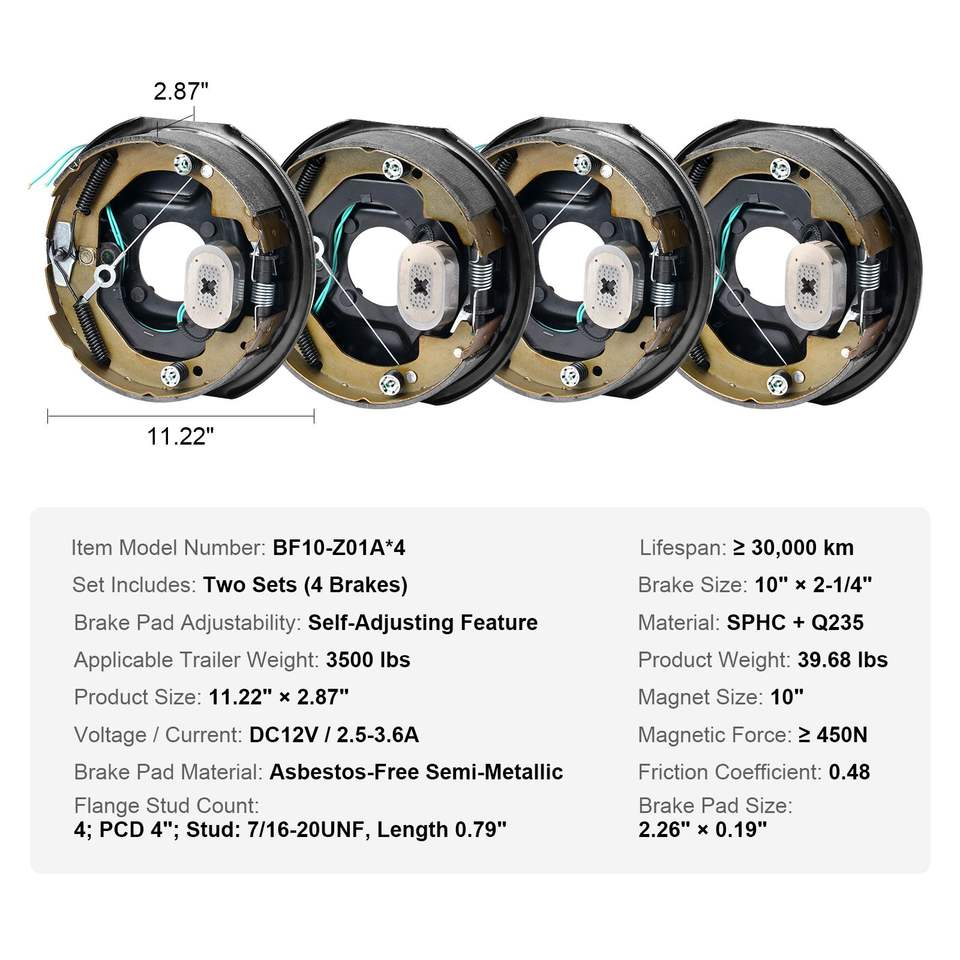 Kit Freni Elettrici Auto-Regolanti per Rimorchio 10'' x 2-1/4'' (2 Paia) per Assali da 3500 Libbre con Montaggio a 4 Fori per Camion