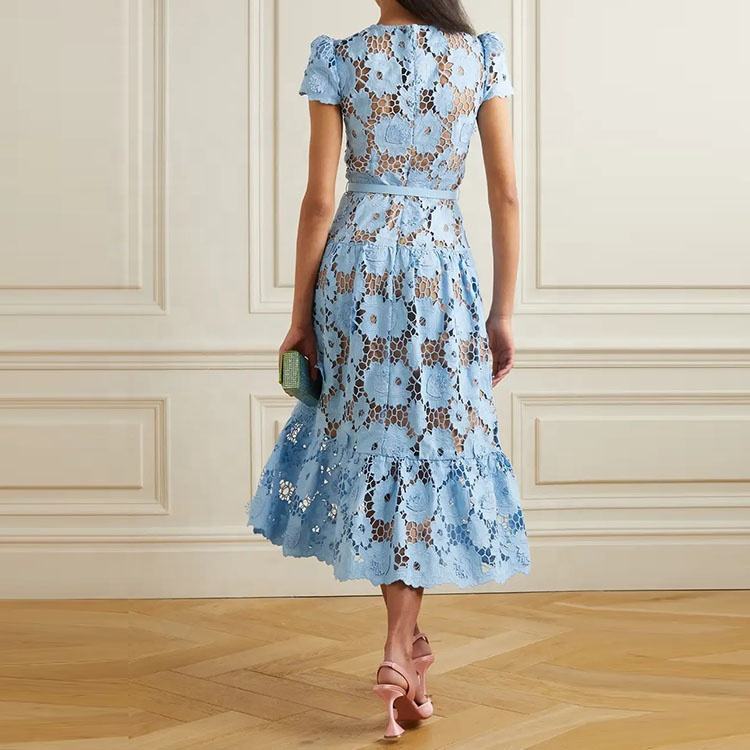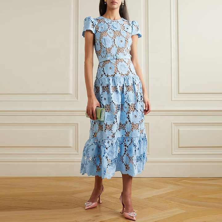 Elegante Abito Lungo Casual Blu Cielo con Fiori Traforati, Vestito Sexy da Donna con Scollo a O