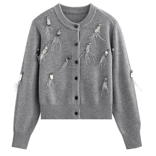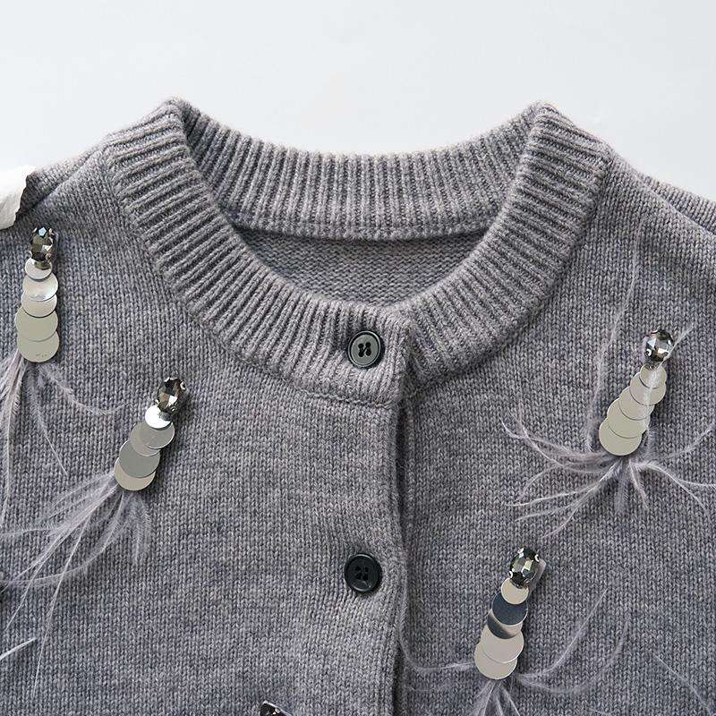 Elegant 100% Wool Handmade Women's Cardigan Open Front with Feather and Sequins Design Long Sleeve Knitwear for Winter