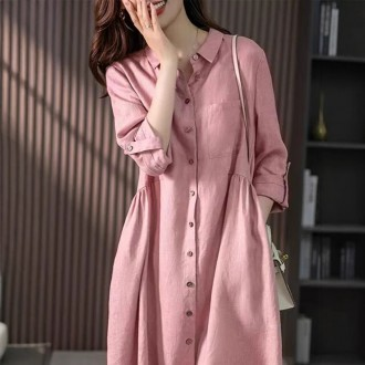 Elegant 2025 Spring Fall One-Piece Dress French Linen Skirt Shirt Design Slim & Precious Solid Color