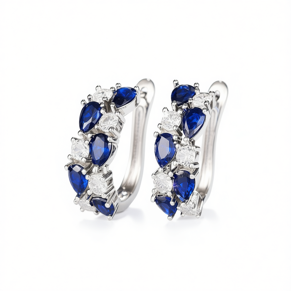 Eleganti Orecchini a Cerchio in Argento 925 con Zaffiro Blu e Diamante Rotondo, Gioielli Classici da Sposa per Donna