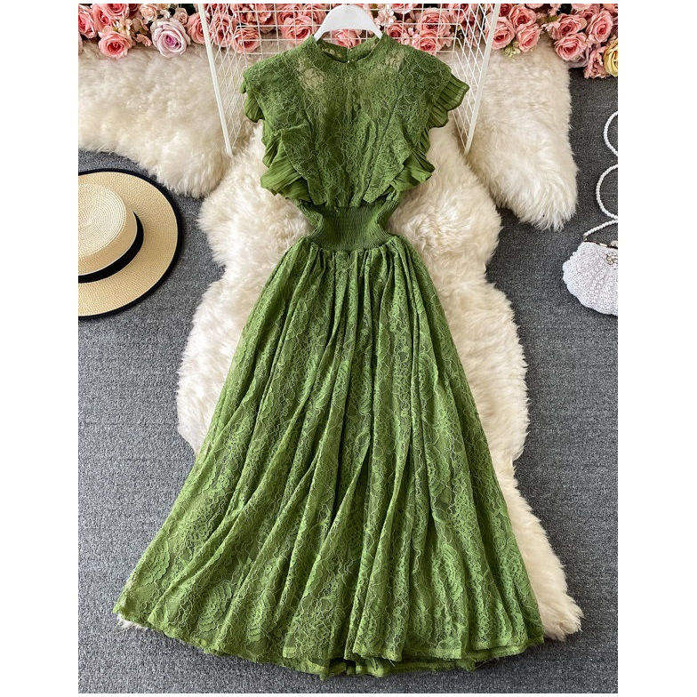 Elegante Abito Midi a Trapezio per Primavera Autunno, Senza Maniche, con Volant, Formale, in Pizzo, Vita Impero, Collo Alto, Realizzato in Fibra di Poliestere