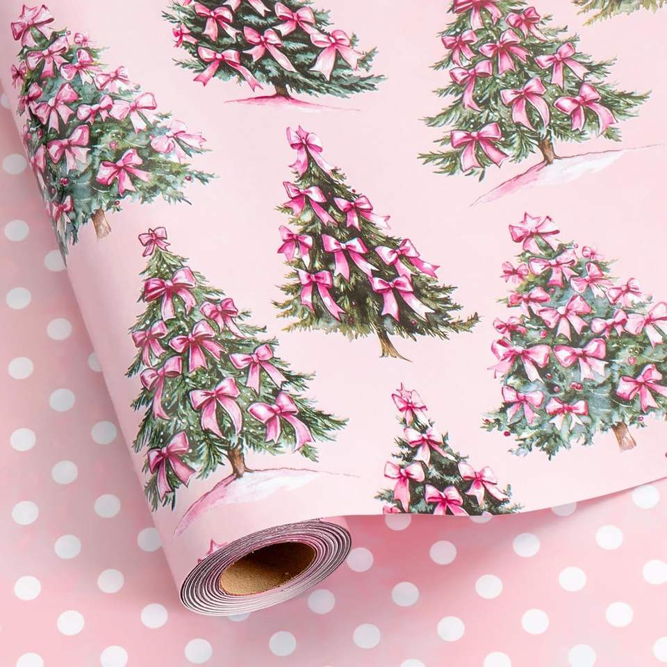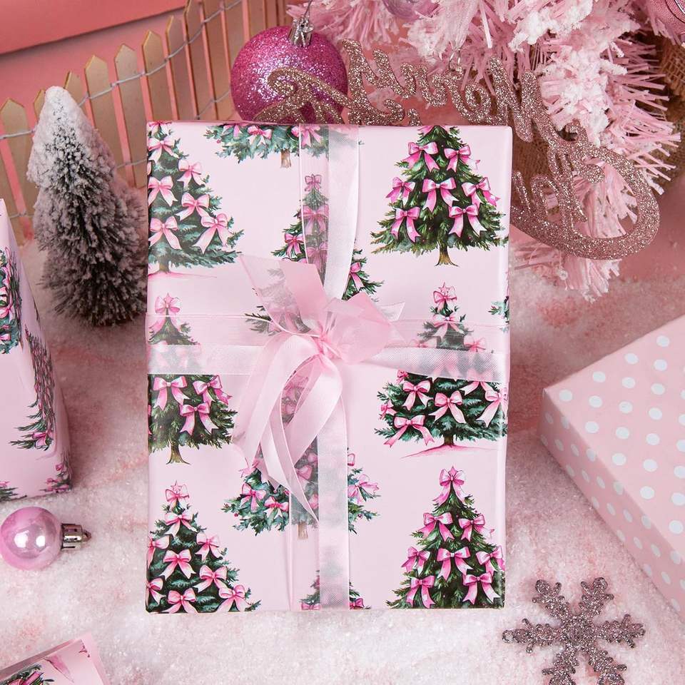 Elegante Rotolo di Carta da Regalo con Fiocchi Rosa per Albero di Natale, Confezione Regalo Femminile con H per Packaging di Lusso