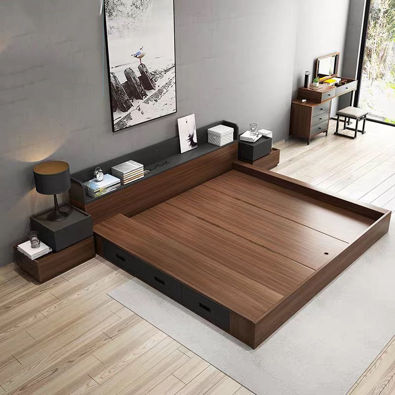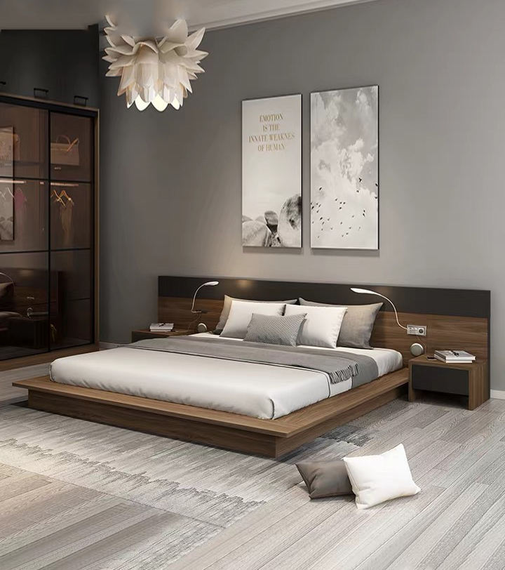 Elegant Design Hotel Bedroom Furniture Wooden Durable Melamine MDF King Queen Size Double Bed With Nightstand