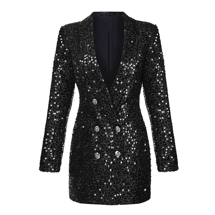 Elegante Doppio-petto Manica Lunga Profondo Scollo A V Nero di Inverno Delle Donne Giacca di Paillettes