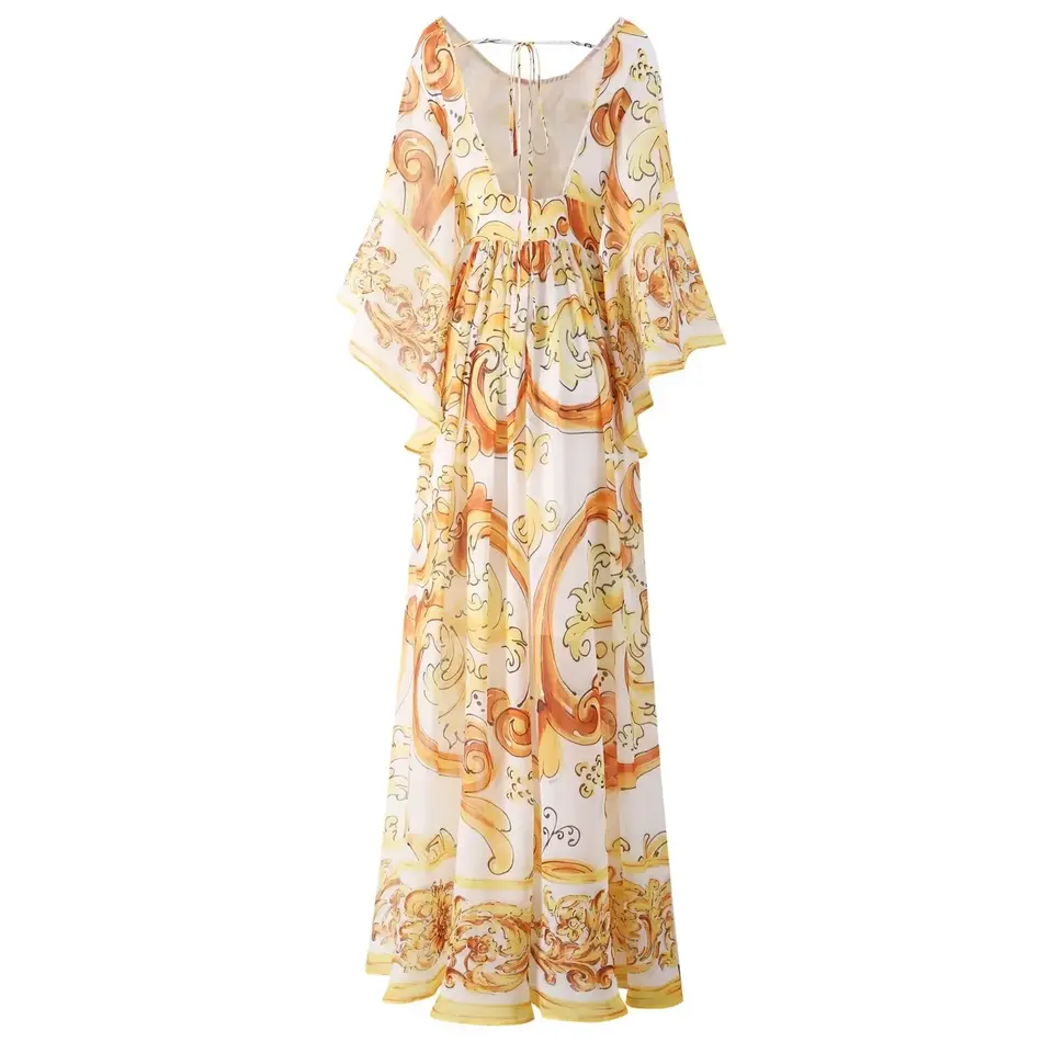 Elegant Long Dress Summer Spring New Fashion Design Women Runway Backless Flare Sleeve Vintage Yellow Print Chiffon