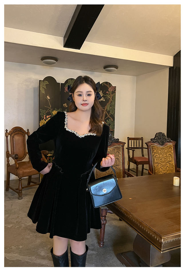 Elegant Midi Gala Dress Plus Size French Style Square Neck Splicing Diamond Chain Princess Dress Curvy Vestido Corte Princesa