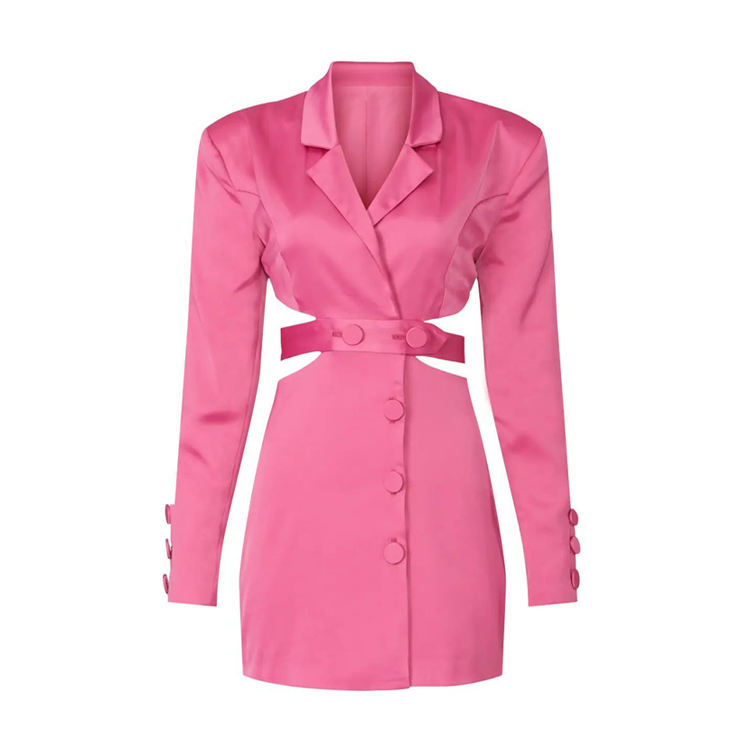 Elegant Mini Tuxedo Blazer Dress for Office Ladies Orange Pink Crepe Long Sleeved Hollow Body Button Decoration Plain Dyed Dress