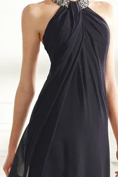 Elegant Minimalist Black Chiffon Floor-Length Summer Evening Bride's Mother Beaded Crystal Diamond Studded Natural Draped Pleat