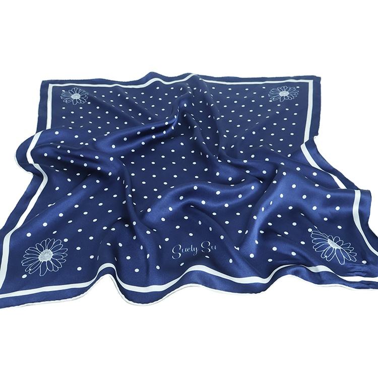 Elegant Navy Blue Daisy Polka Dot Scarf 60x60cm 14 Momme Silk Satin Digital Print Luxurious Fashion Accessory
