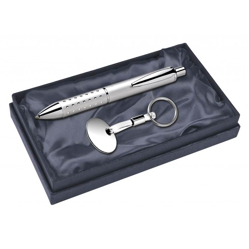 Elegante Set Penna e Portachiavi in Metallo Argentato, Regalo Aziendale Premium, Strumento di Scrittura con Anello Portachiavi per Ufficio