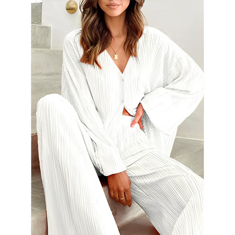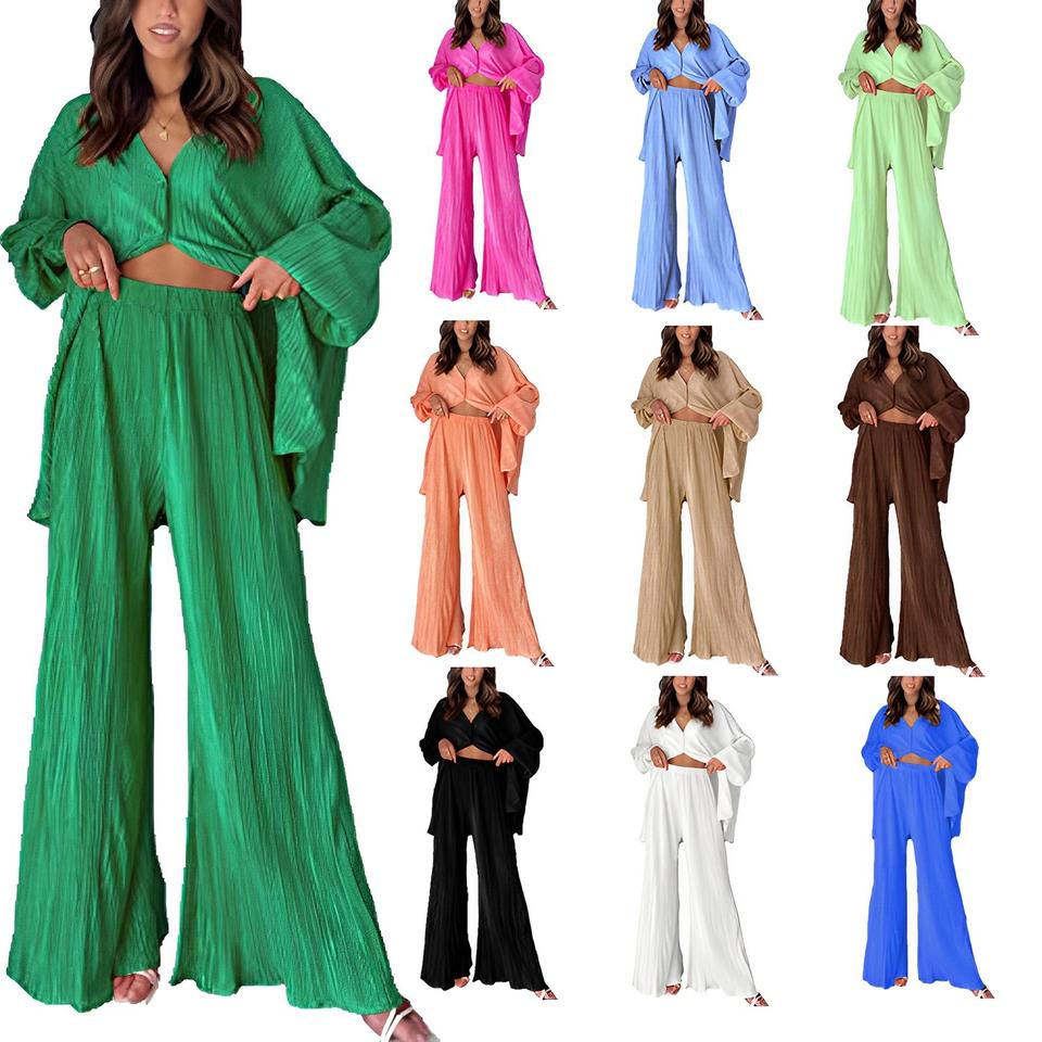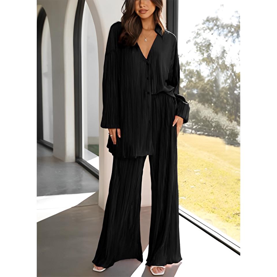 Elegant Pleated Beige 2 Piece Pant Sets Outfits Causal Loose Home Suit Autumn Long Sleeve Blouse Pants Set Women Pajamas Set