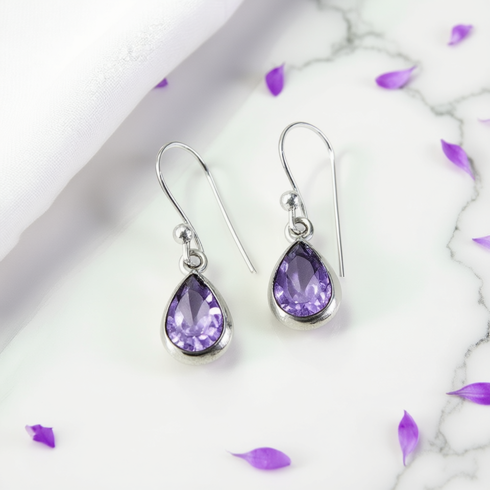 Elegant Purple Gemstone Teardrop Earrings 925 Silver Bezel Setting Women's Everyday Wear Drop Earrings