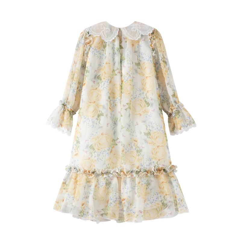Elegante Abito in Chiffon Floreale con Balze per Bambine 2-12 Anni Maniche Lunghe Orlo Arricciato in Pizzo ODM