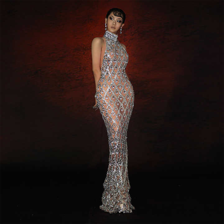 Elegante Abito Lungo da Sera in Tulle Trasparente con Strass per Cerimonie, Compleanni, Matrimoni e Feste