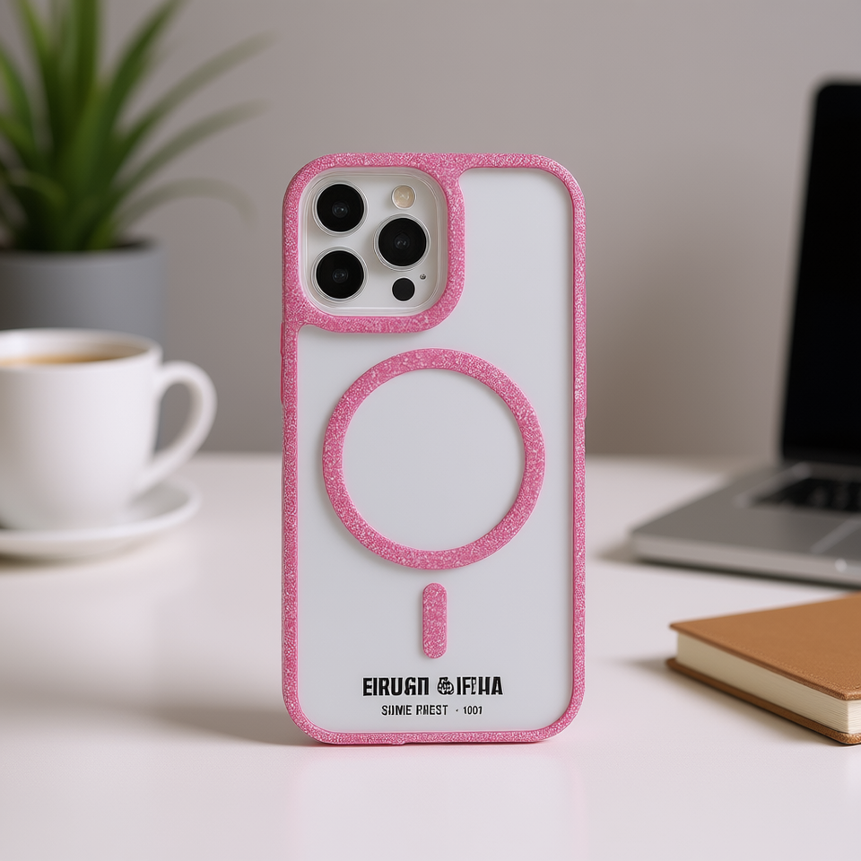 Elegante custodia magnetica per telefono con bordo glitterato, protezione antiurto in TPU, design trasparente, supporto regolabile e ricarica rapida.