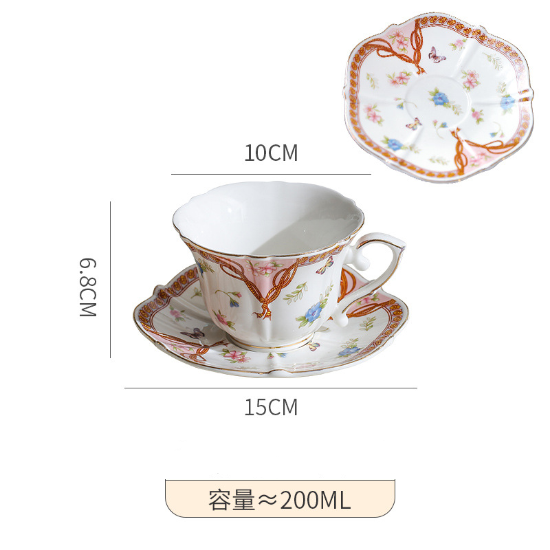 Elegant Vintage Luxury Style White-Pink-Orange Gold-Trimmed Painted Floral Bow Butterfly Ceramic Coffee/Tea Cup Saucer Set 200ML