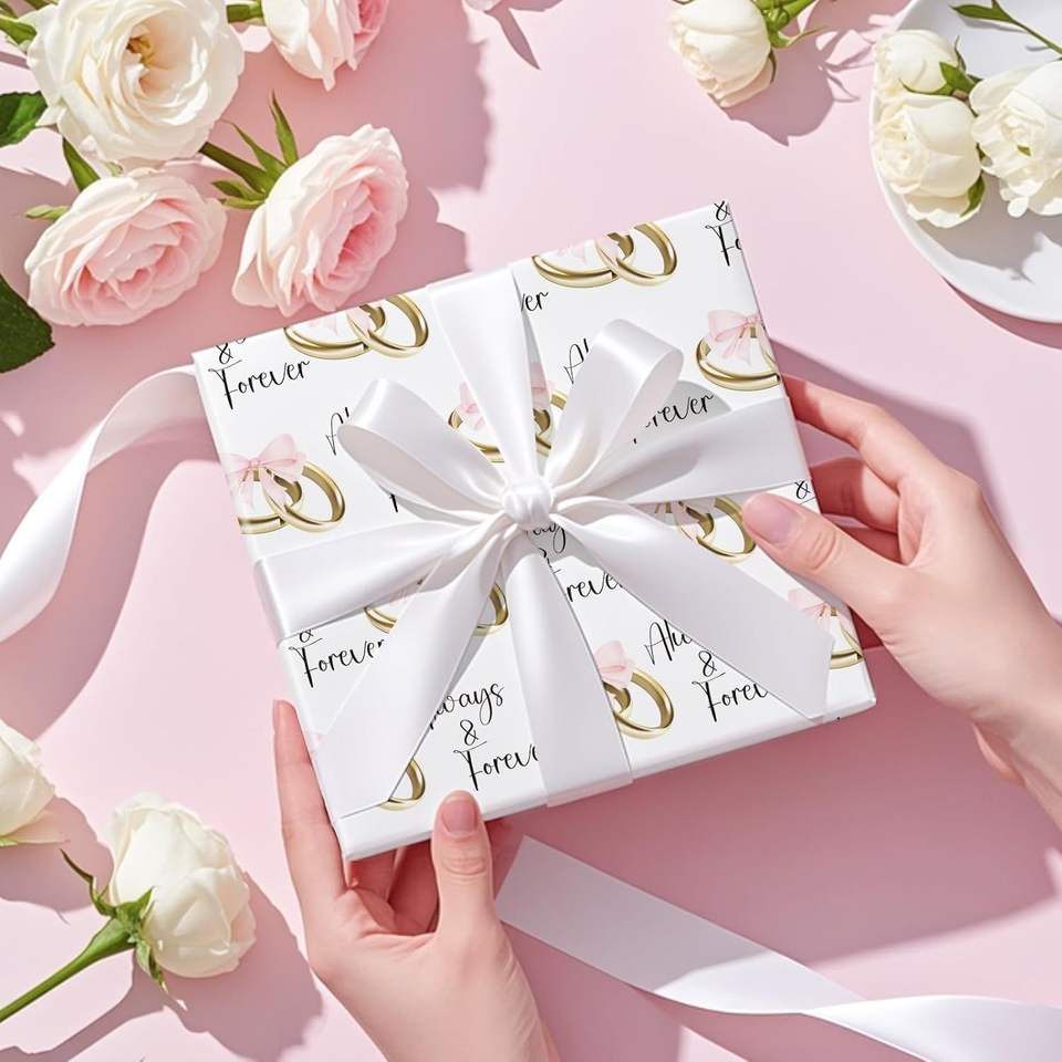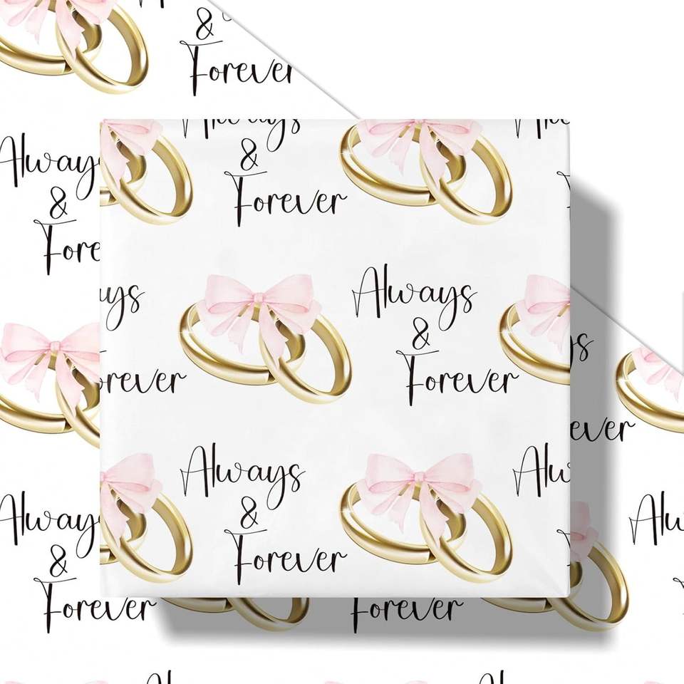 Elegante Rotolo di Carta da Regalo per Matrimoni, Formato Mini, Fiocchi Rosa con Anelli Dorati, Design con Testo 'Always Forever' per Etichette e Biglietti di Gioielli