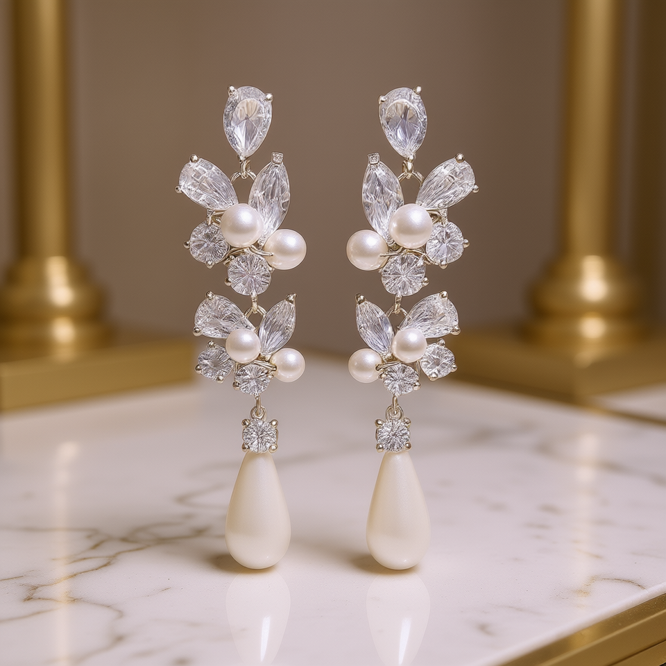 Elegant White Gold Flower Chandelier Earrings With Crystal Rhinestone And Pearl For Wedding Women's 925 Silver Jewelry