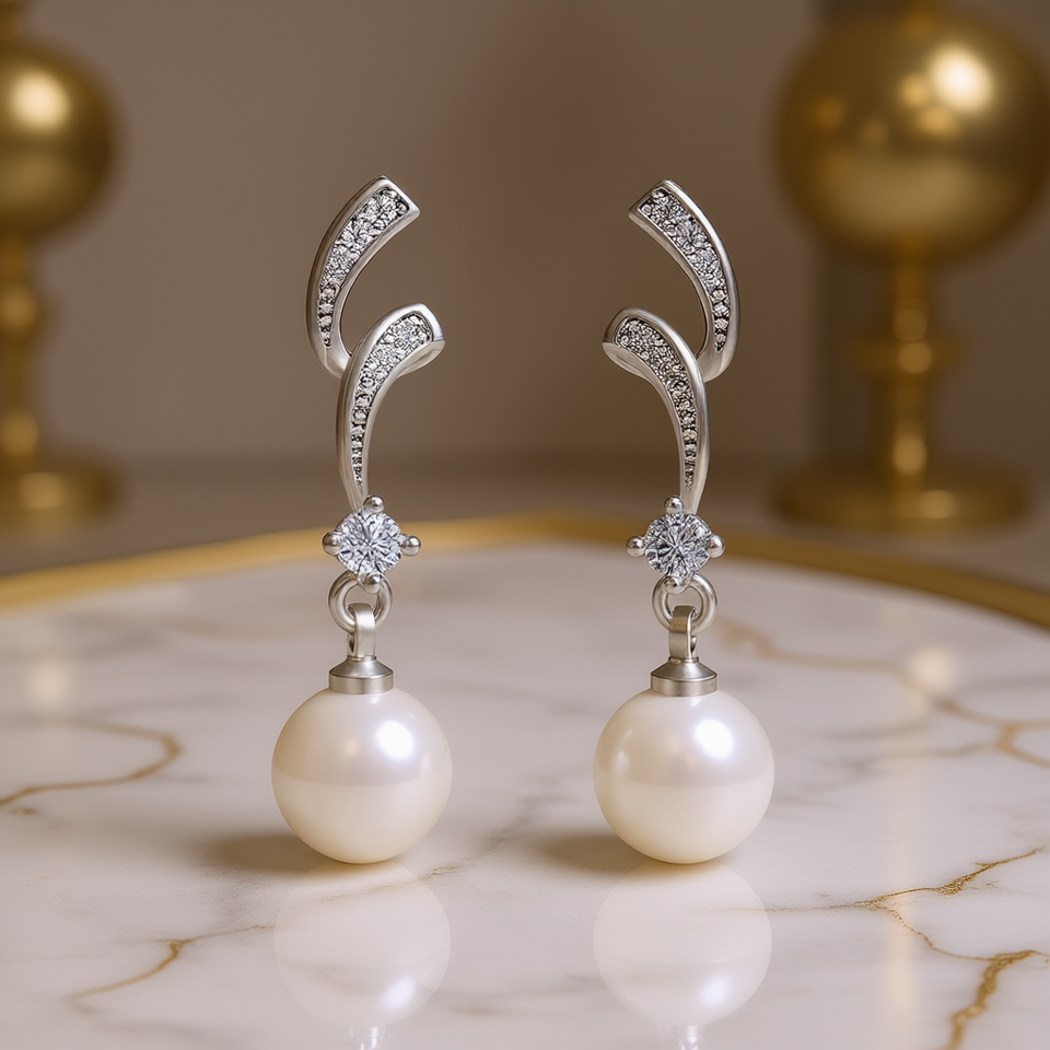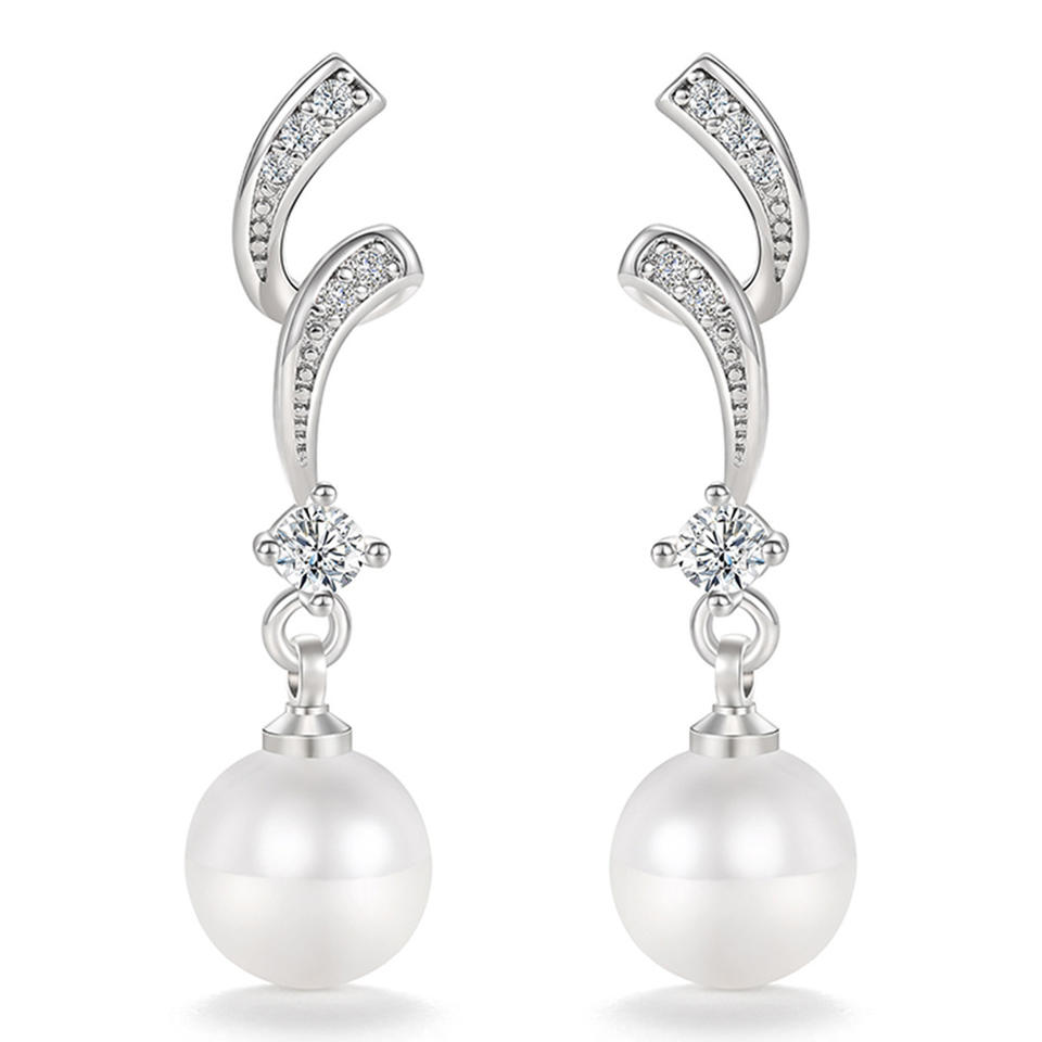 Elegant White Gold Plated 925 Silver Drop Earrings With AAA Round Faux Pearl And Diamond Accents For Women Wedding Classic Style