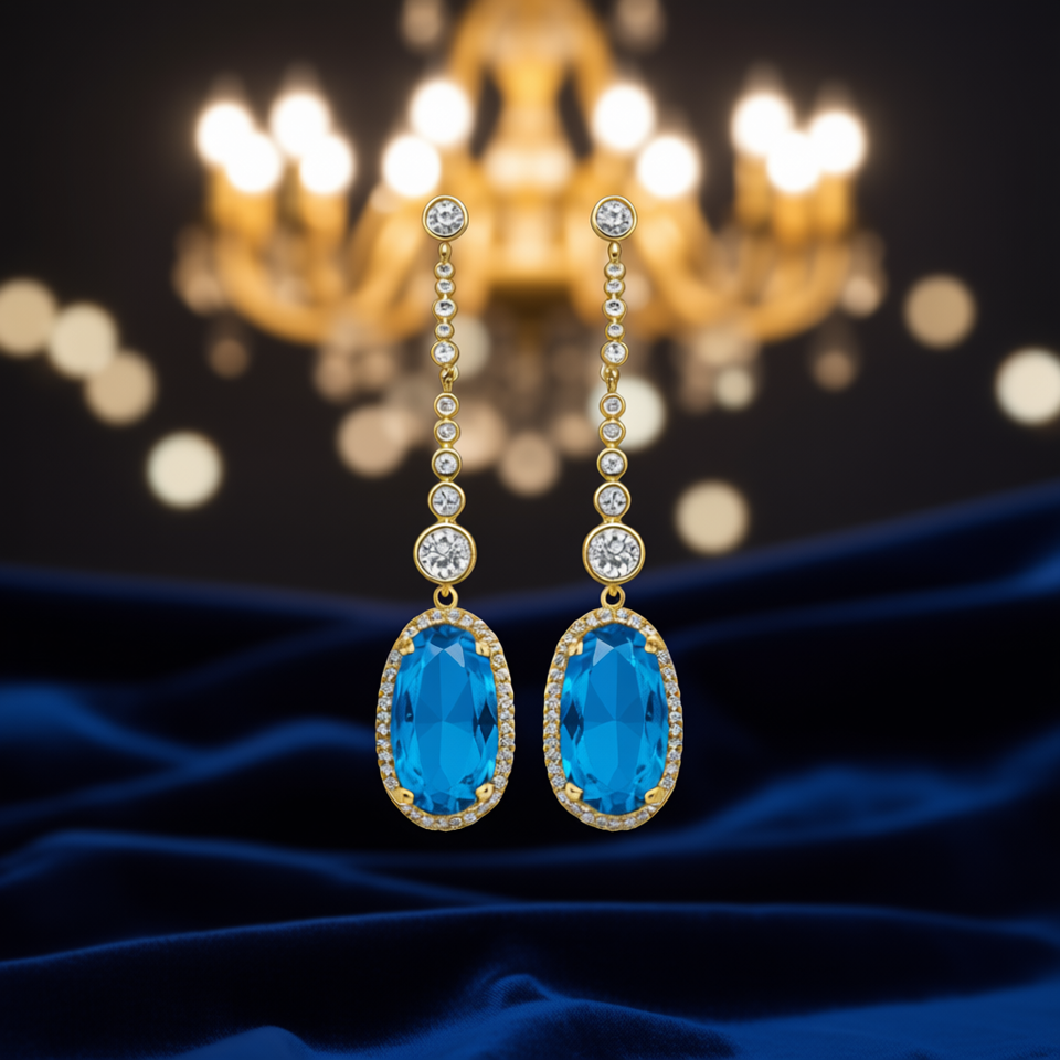 Elegant Women's 18K Gold Plated Drop Earrings With Blue Topaz And Round Diamond Bezel Setting Classic Party Jewelry