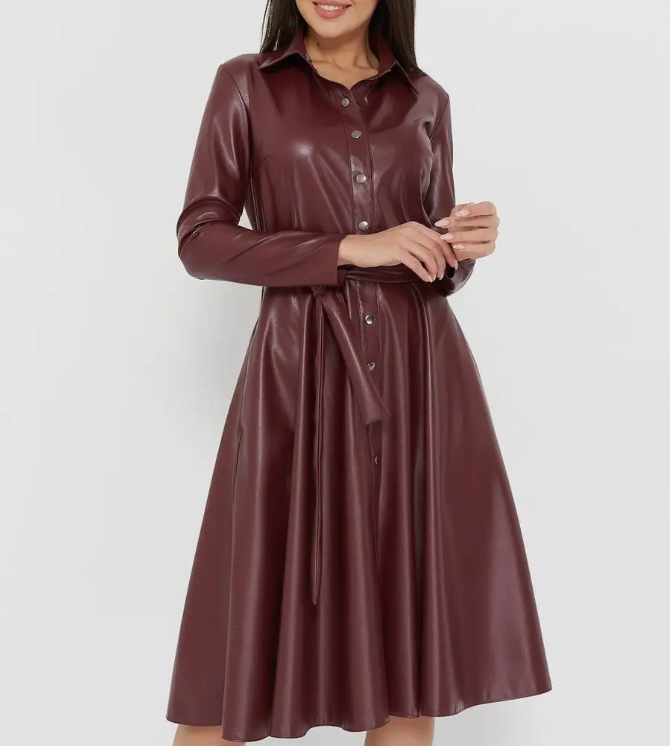 Elegant Women's Burgundy Leather Shirt Dress Long Sleeve Belted Midi Dress with Button Front for Party & Casual
