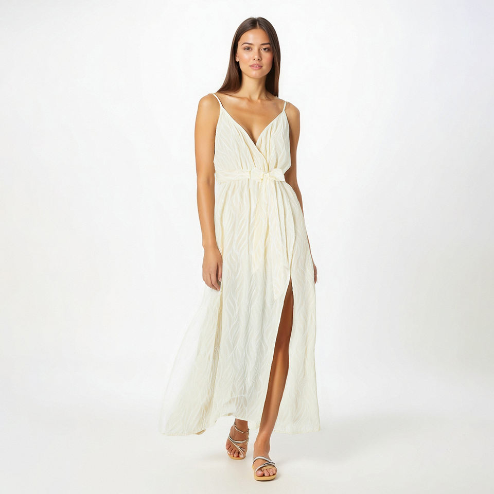 Elegante Abito Lungo da Donna con Spacco, Ricamo e Perline, Scollo a V, Casual e Texturizzato per Vacanze