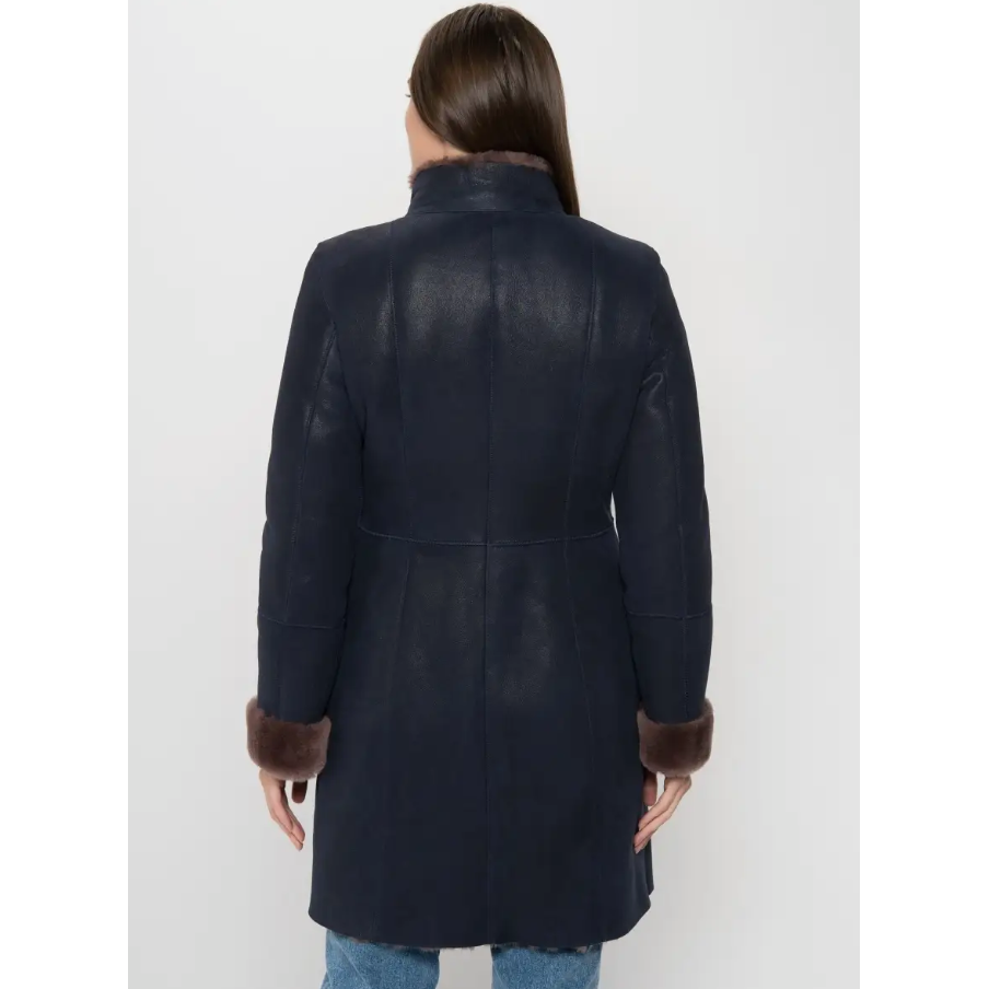 Elegant Women's Navy Blue Shearling Coat Soft Brown Fur Lining 100% Genuine Sheepskin Winter Jacket Zipper Closure OEM Private