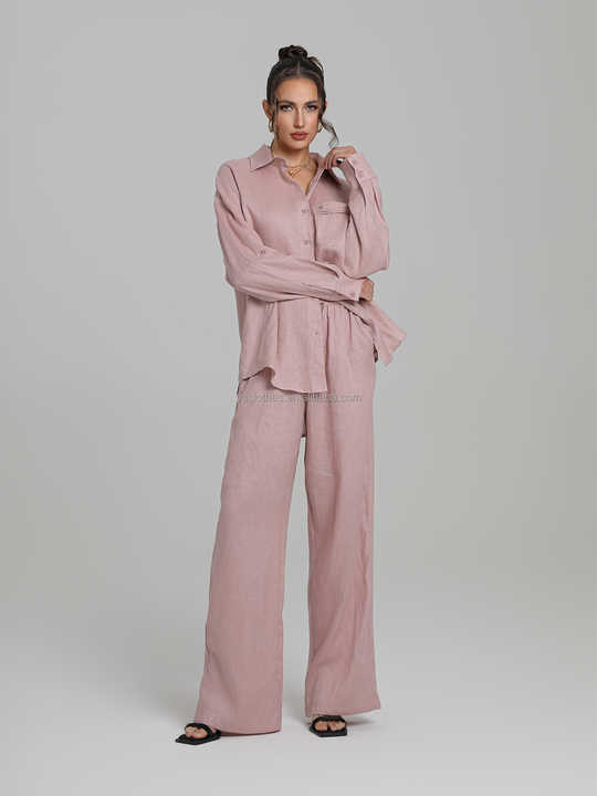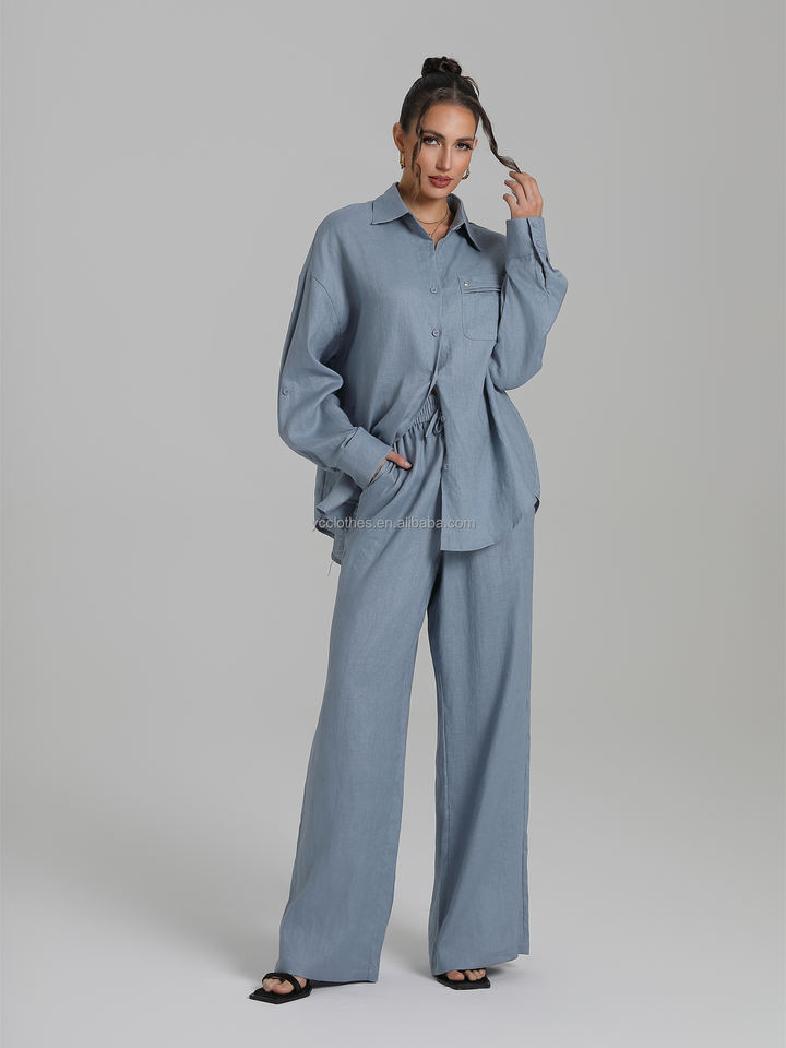 Elegante Set da donna Color pelle di lino a maniche lunghe camicia tinta unita pantaloni larghi stile Casual per il pendolarismo di lino 100%