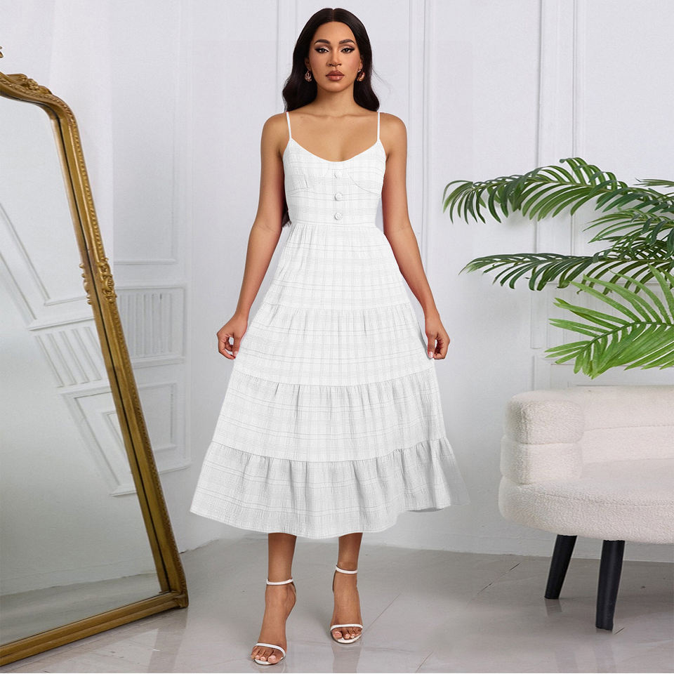 Elegant Women's Sweet A-Line Strappy Dress French Casual Empire Waistline Ruched Design Buttons Floor-Length Long Ruffled Summer