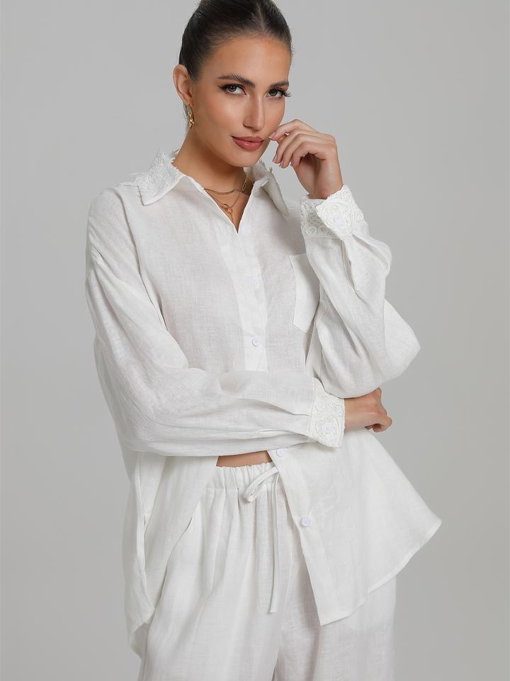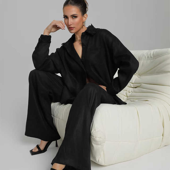 Elegant Women's Two-Piece Summer Set Formal Linen French Shirt with Solid Pattern and Wide-Leg Pants Long-Sleeved