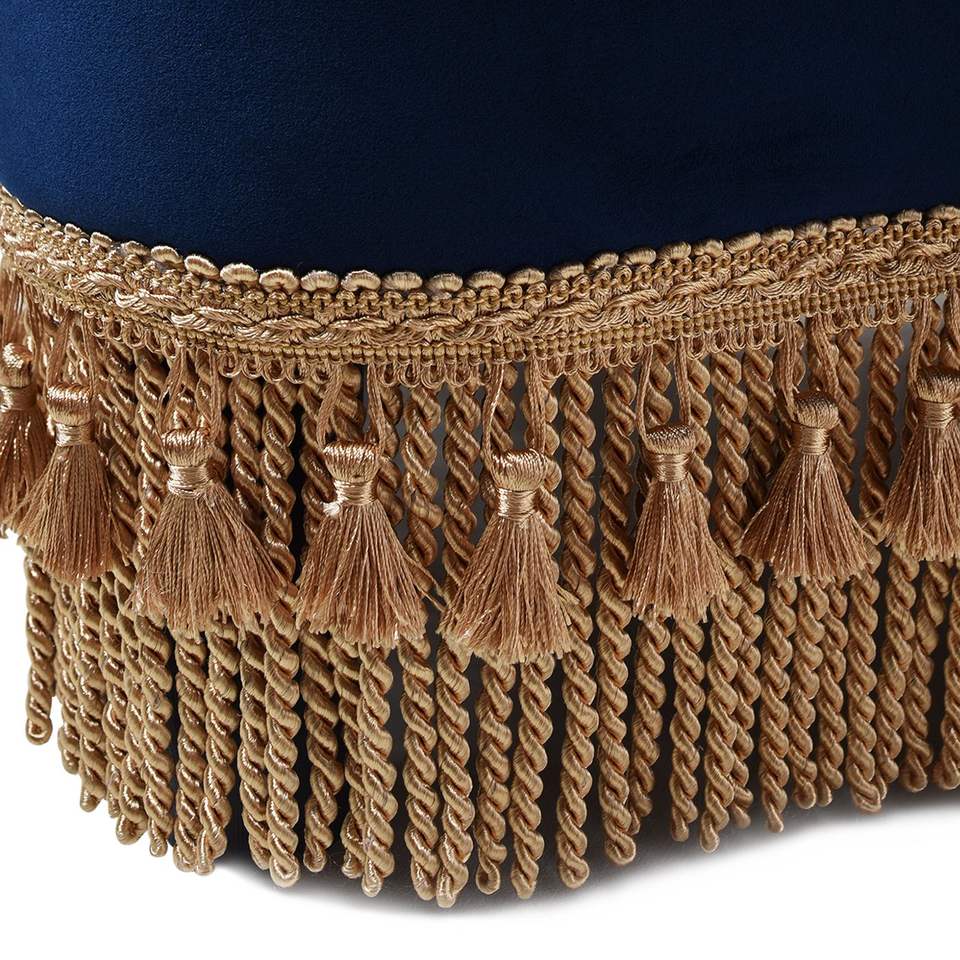 Pouf trifoglio imbottito in velluto blu Navy Ellen con frange di lingotti d'oro e sgabelli ottomani