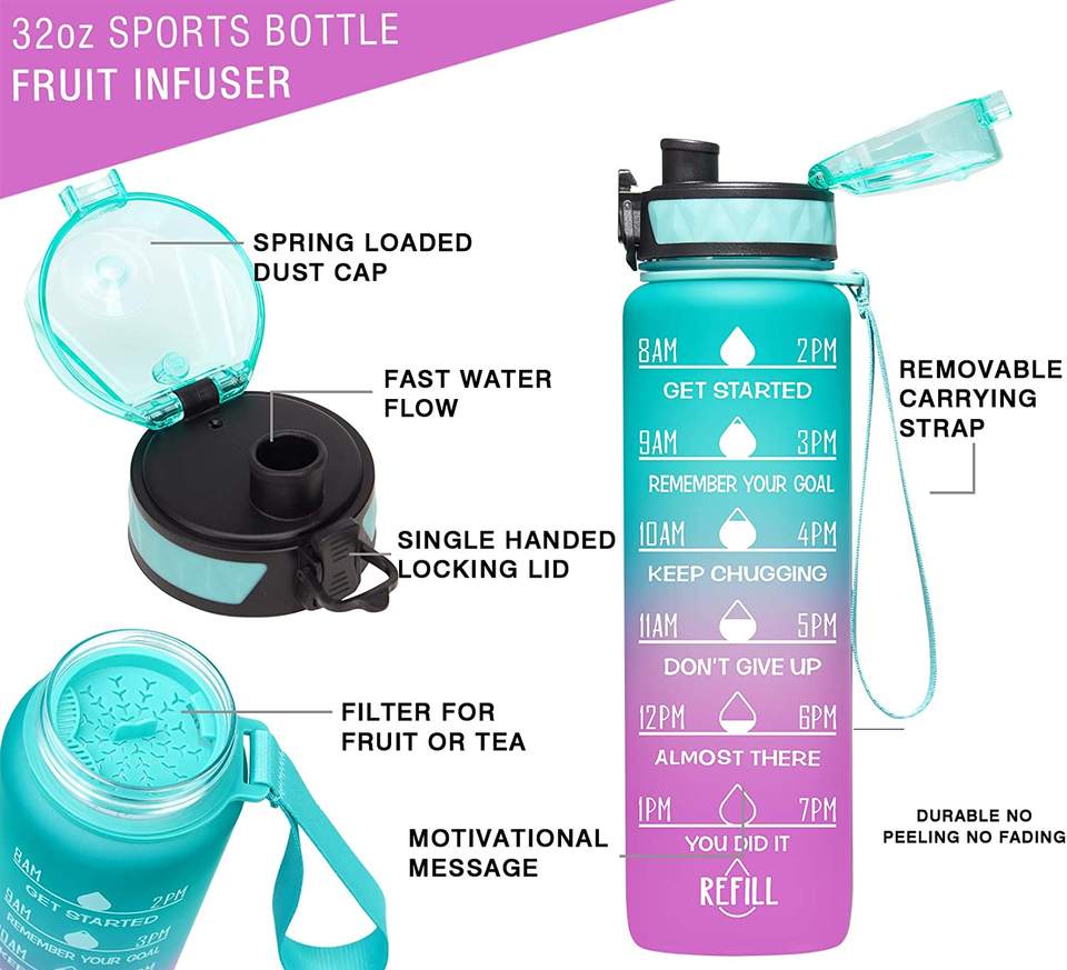 Elvira 32oz Motivational Fitness Sports Water Bottle with Time Marker & Removable Strainer,Fast Flow,Flip Top Leakproof Durable