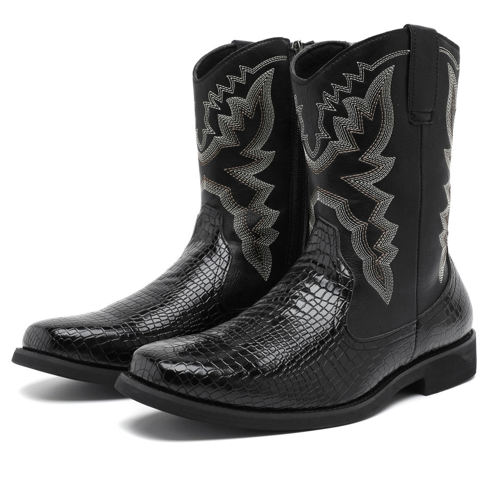 Stivali da Cowboy Occidentali in Pelle PU Ricamata da Donna con Punta Tonda e Tacco Grosso, Stivali a Metà Polpaccio Abbinati, Stivali da Cavaliere Vintage Neri