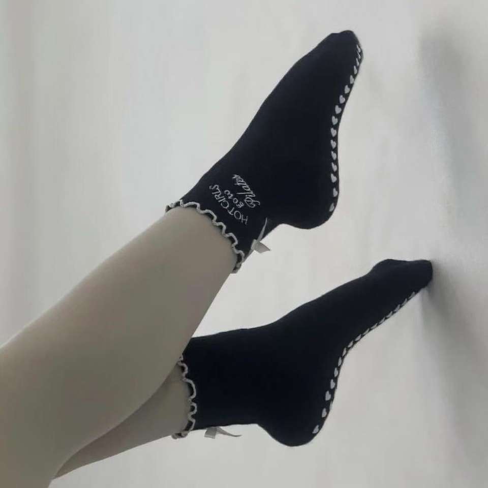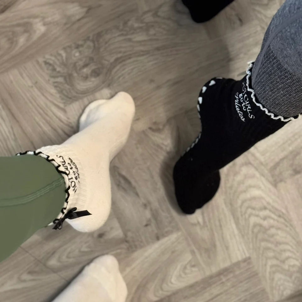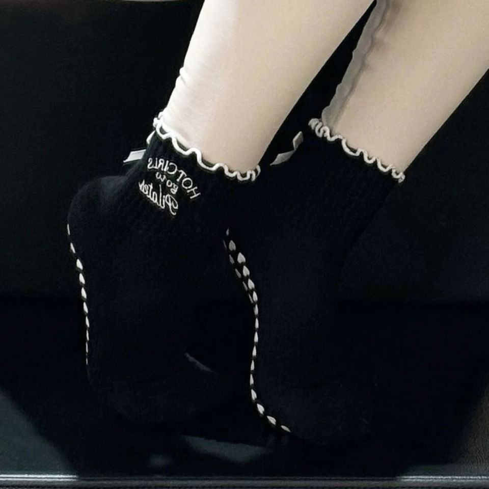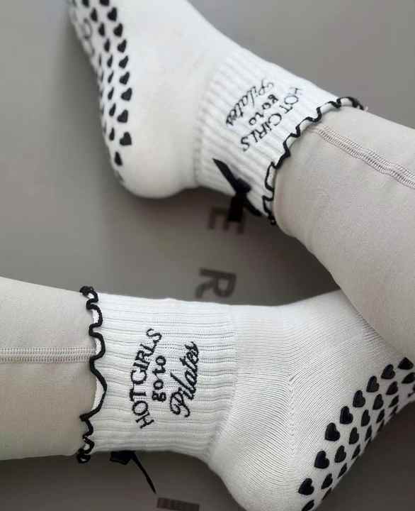 Lettere ricamate Custom Yoga Grip calzini antiscivolo Pilates Reformer calzini economici popolari griffati con fiocchi con volant