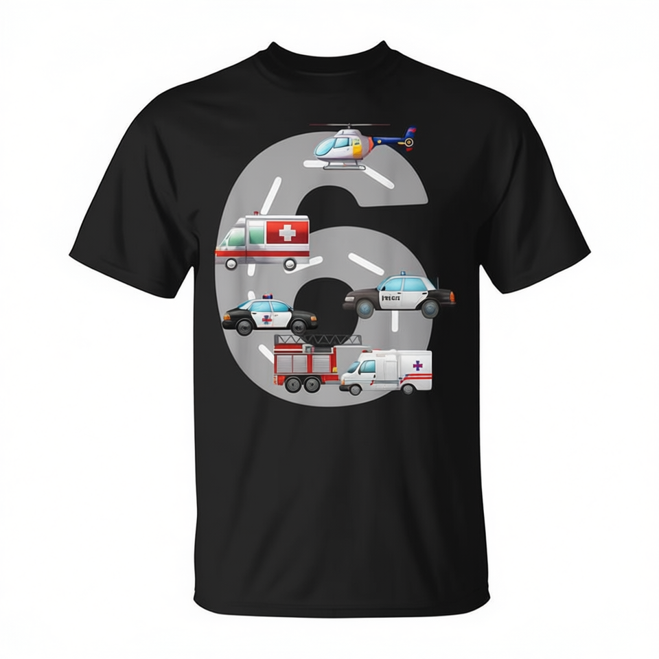 T-shirt per il 6° compleanno dei ragazzi con veicoli di emergenza, design con camion dei pompieri e auto della polizia, girocollo, manica corta, stampa digitale