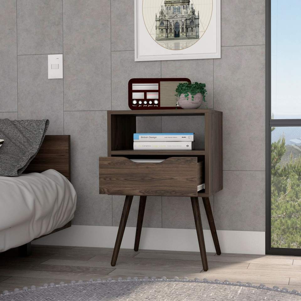 Comodino Emma di Depot E Shop in noce scuro con piano superiore di qualità superiore, quattro gambe, ripiano aperto e un cassetto