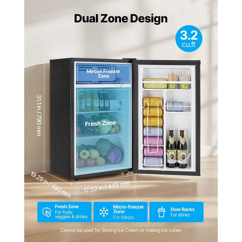Mini Frigorifero Compatto a Porta Singola da 3.2 Cu.Ft ad Alta Efficienza Energetica con Temperatura Regolabile e Ripiano in Vetro