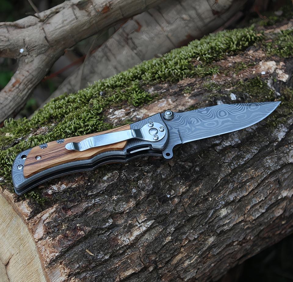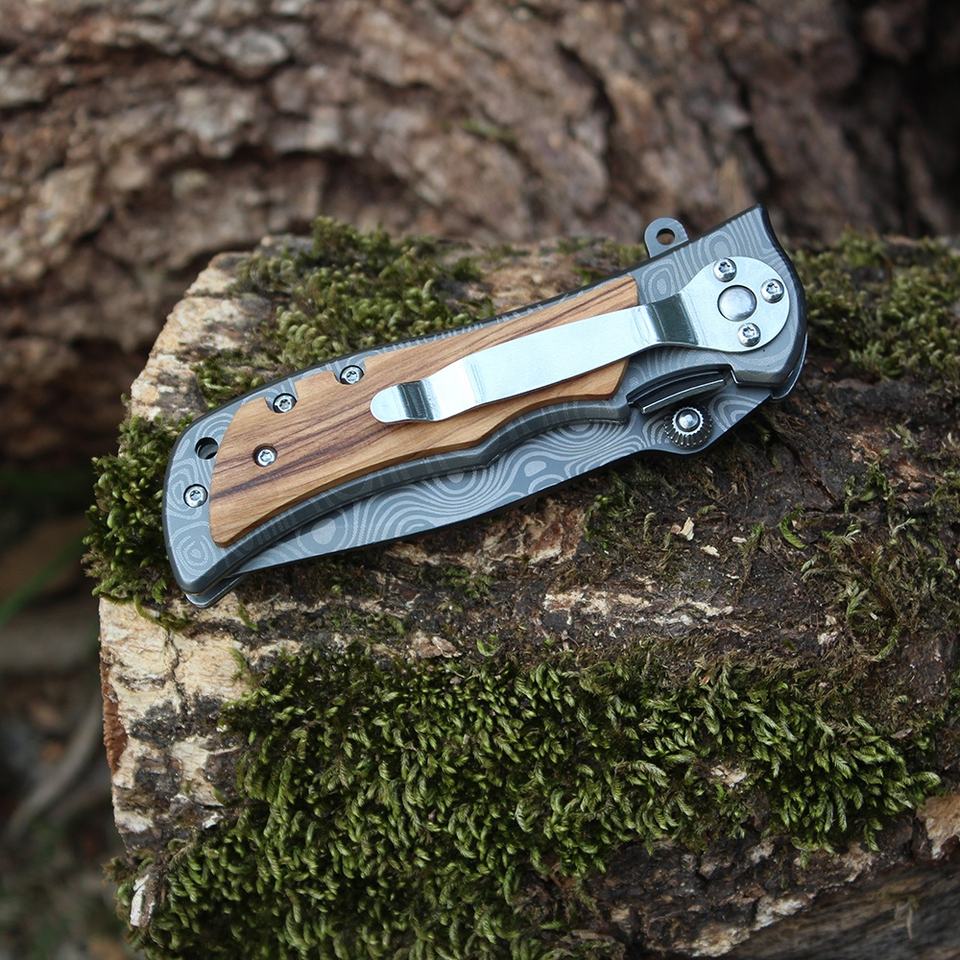 Engraved Olive Wood Handle Self Defense Folding Knife Laser Damascus Pattern Outdoor Survival Bushcraft Tactical Pocket Knife