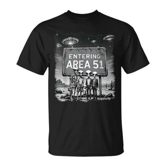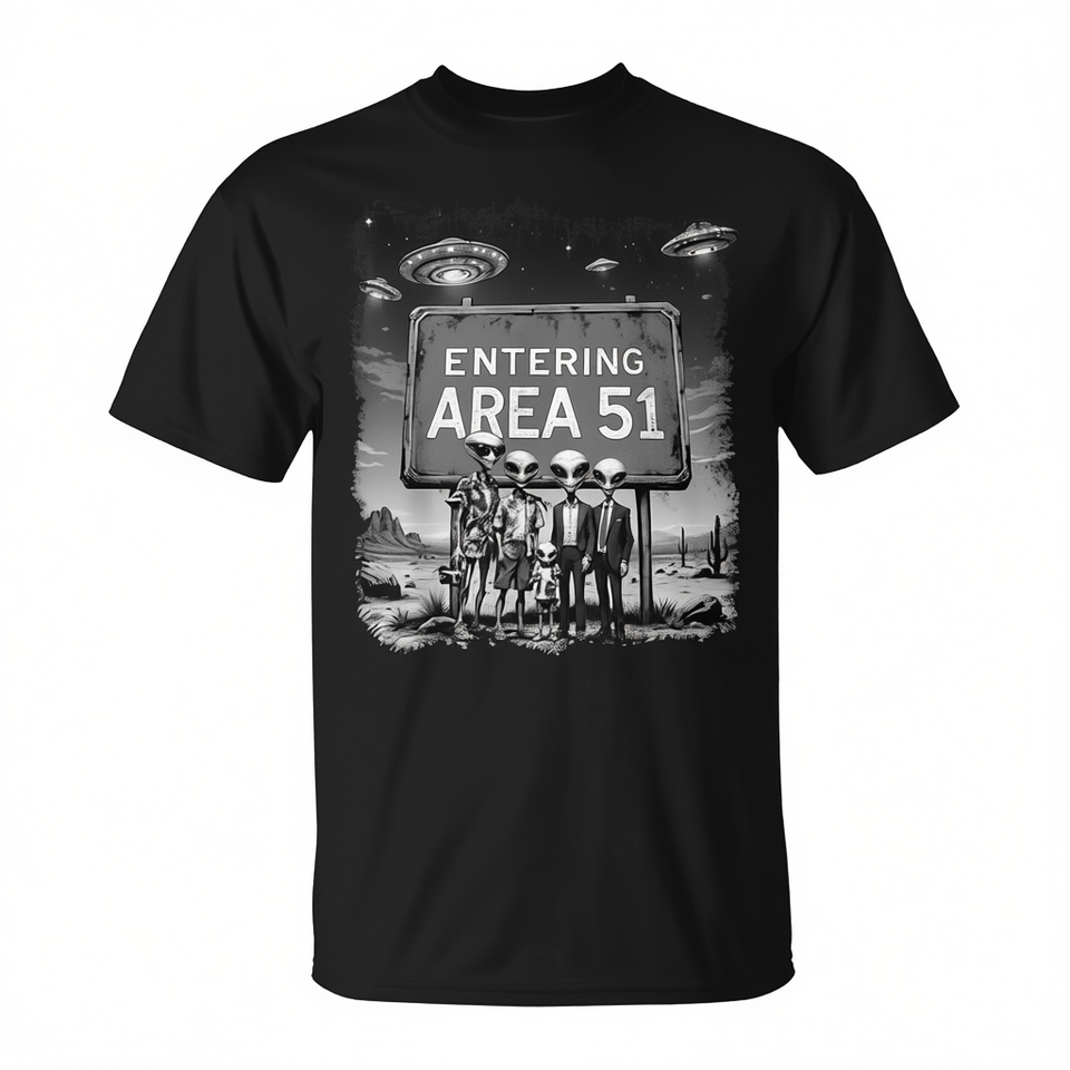 Maglietta da uomo con stampa serigrafica di Alieni e UFO dell'Area 51, girocollo, maniche corte, nera, con grafica.
