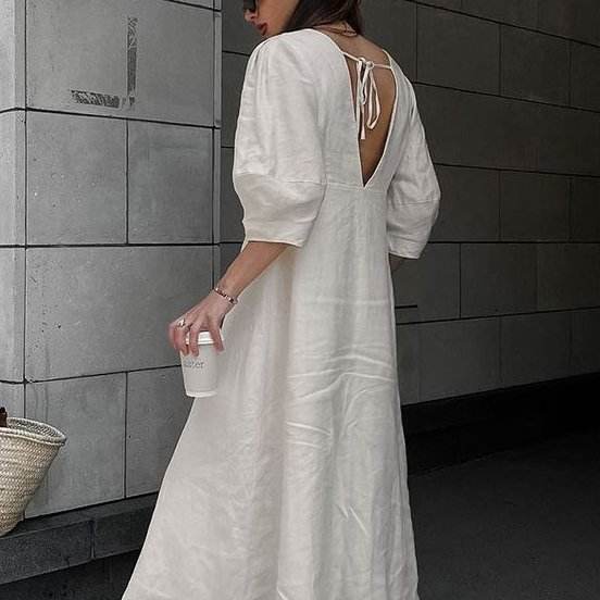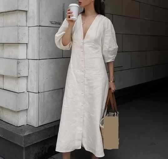 Enyami French Resort Chic Vintage Elegant Cotton Linen V Neck Puff Sleeve Short Dresses Women Casual Loose Shirt Ladies Dress