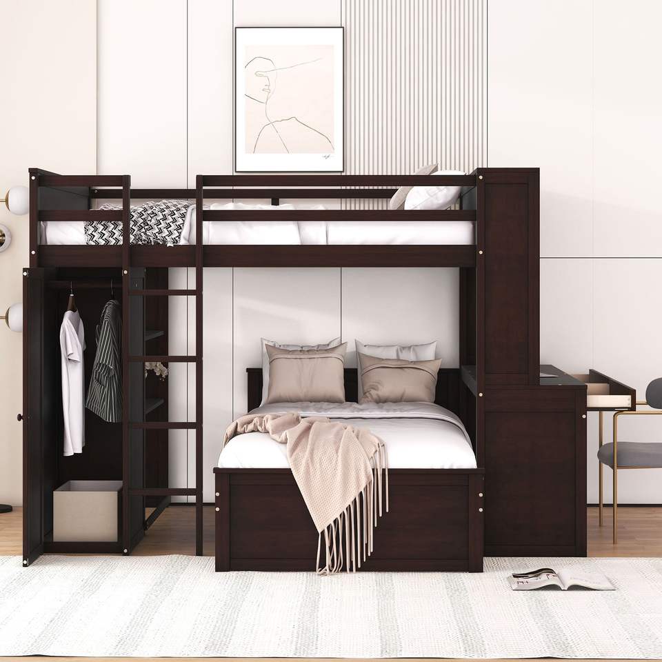 Letto a soppalco Espresso Full-Size con letto singolo indipendente, scaffali, scrivania e armadio - Set camera da letto
