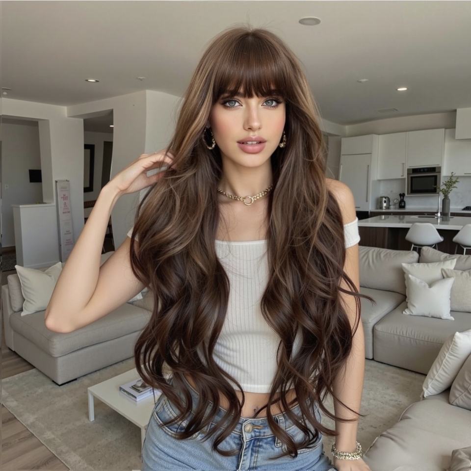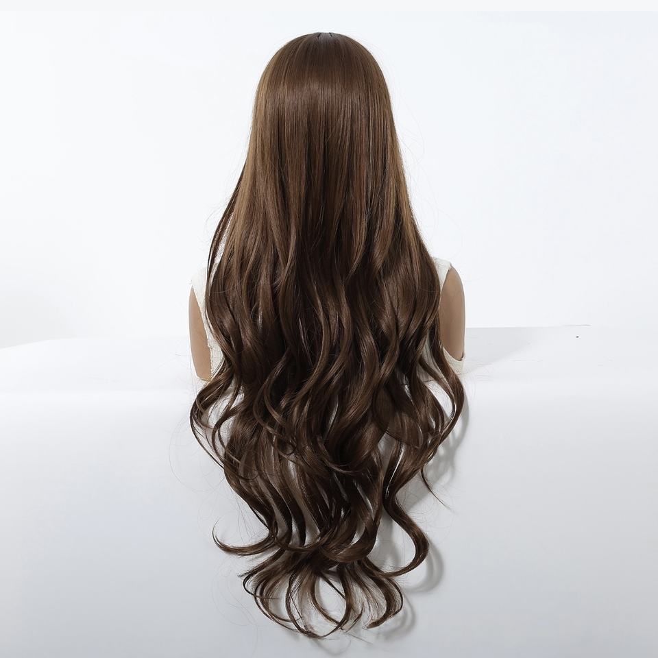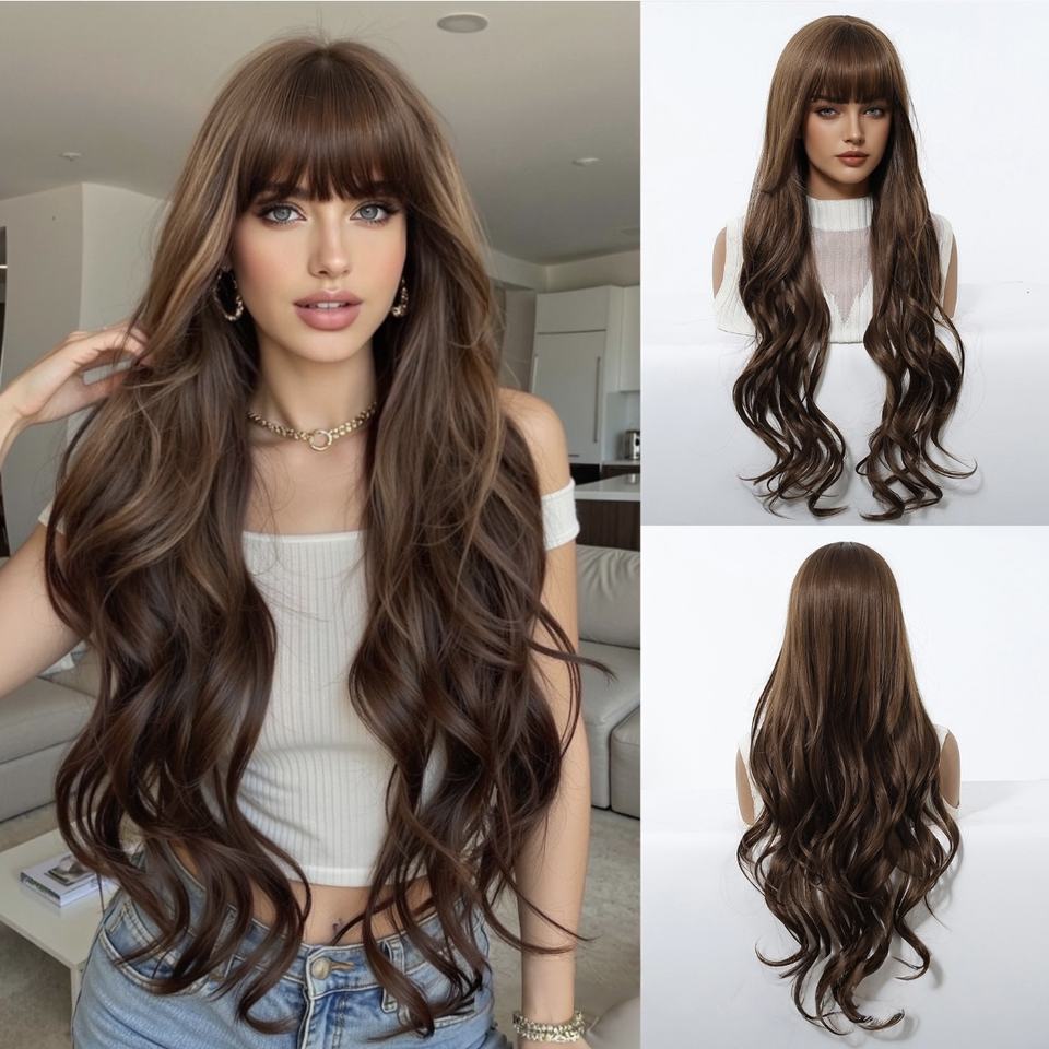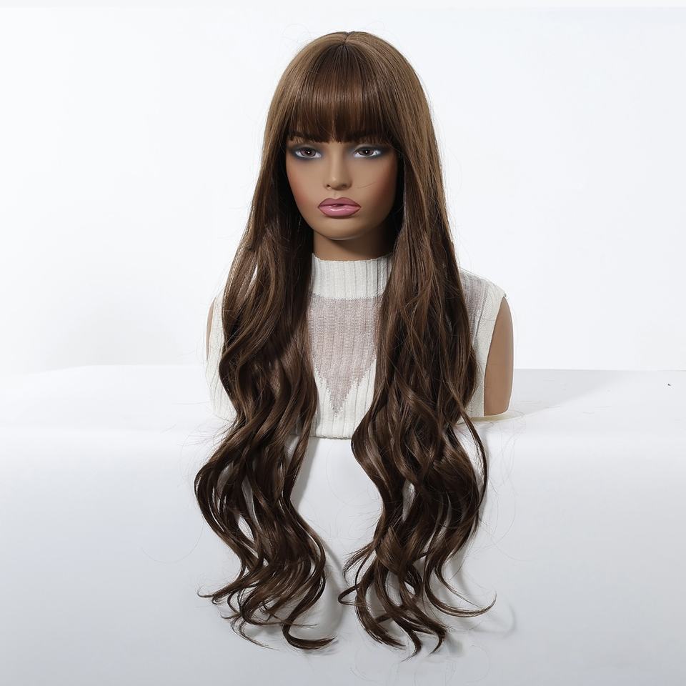 Parrucca Sintetica Lunga e Riccioluta Marrone Scuro con Frangia, Nuova Collezione Europa Stati Uniti, Onde Grandi, Realizzata a Macchina, per Donna