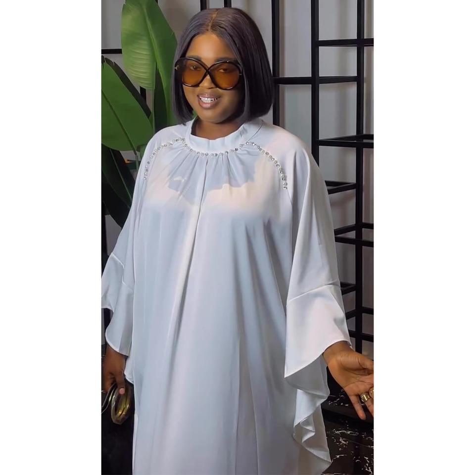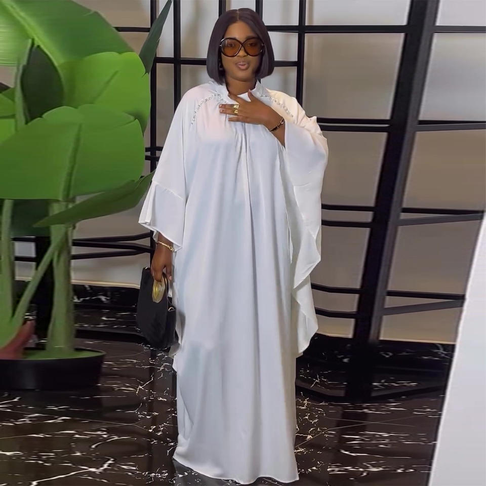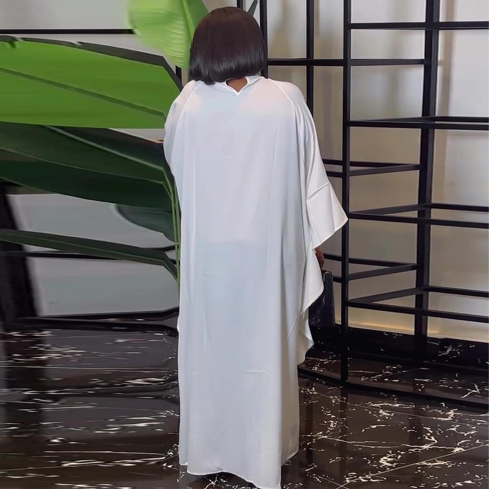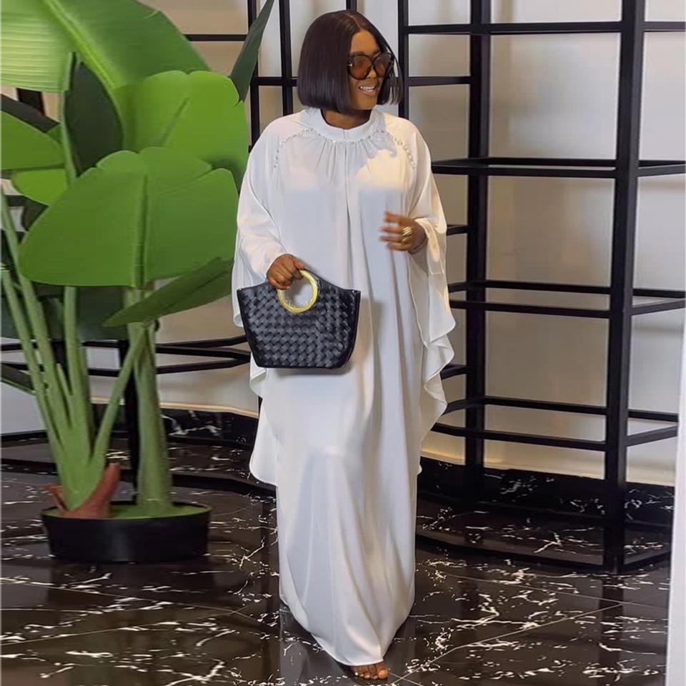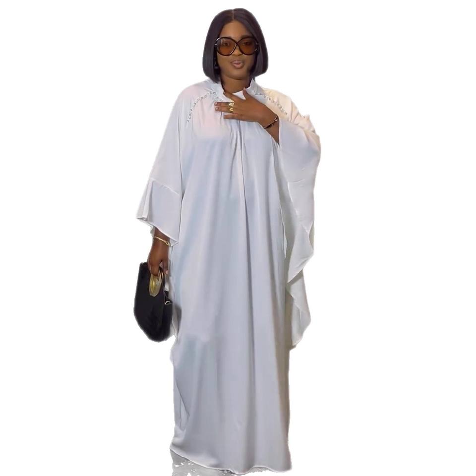 Abito Lungo Bianco Primavera 2026 con Maniche a Pipistrello e Perline, Stile Europeo-Americano, Taglie Forti, Casual