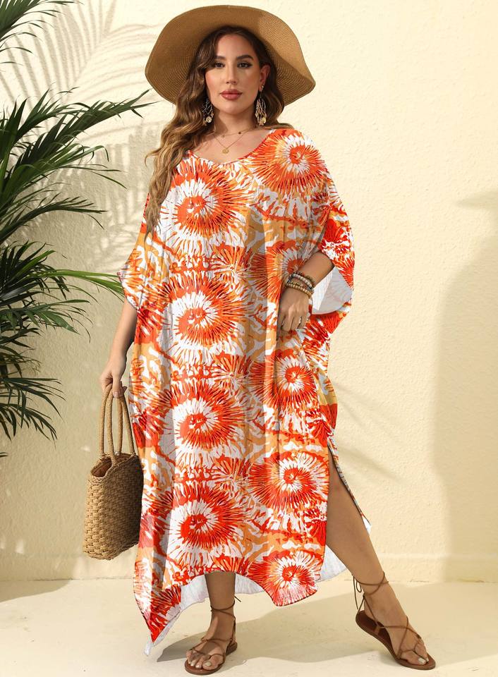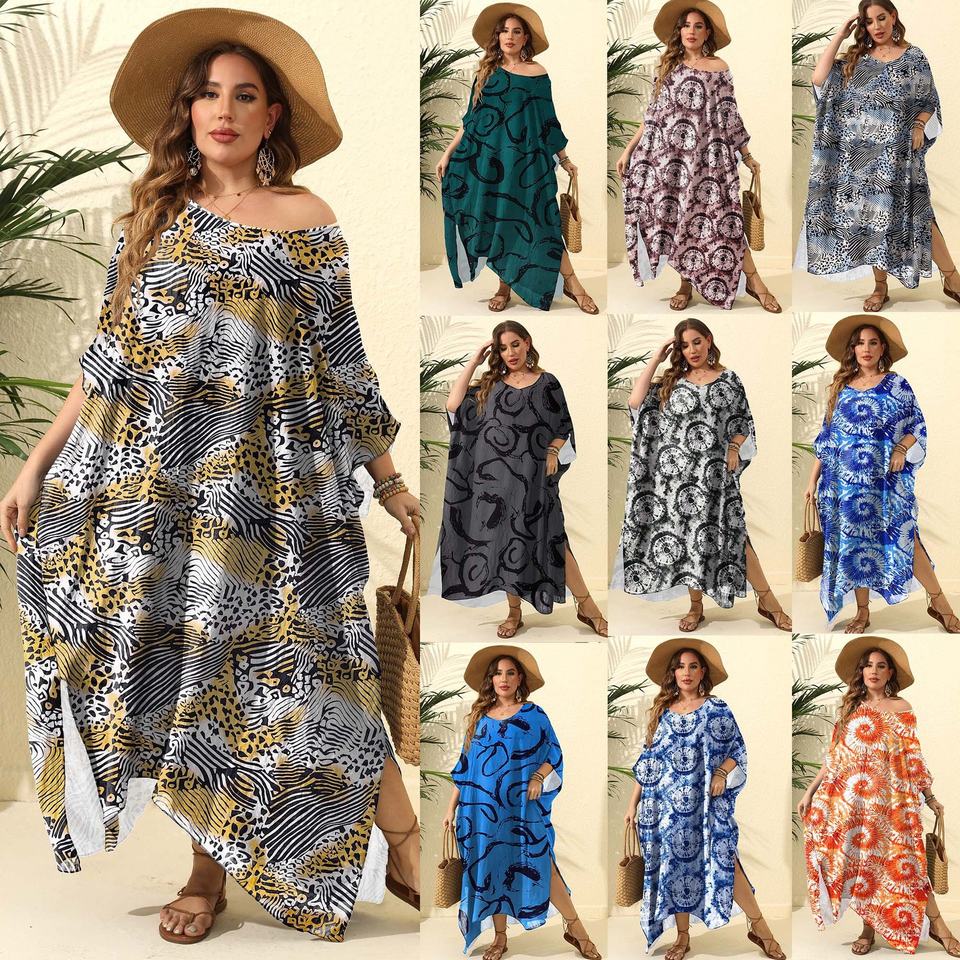 Abito lungo estivo da donna taglie forti, stile europeo-americano, con stampa astratta, vestibilità ampia, senza maniche, scollo a V, con spacco, in poliestere
