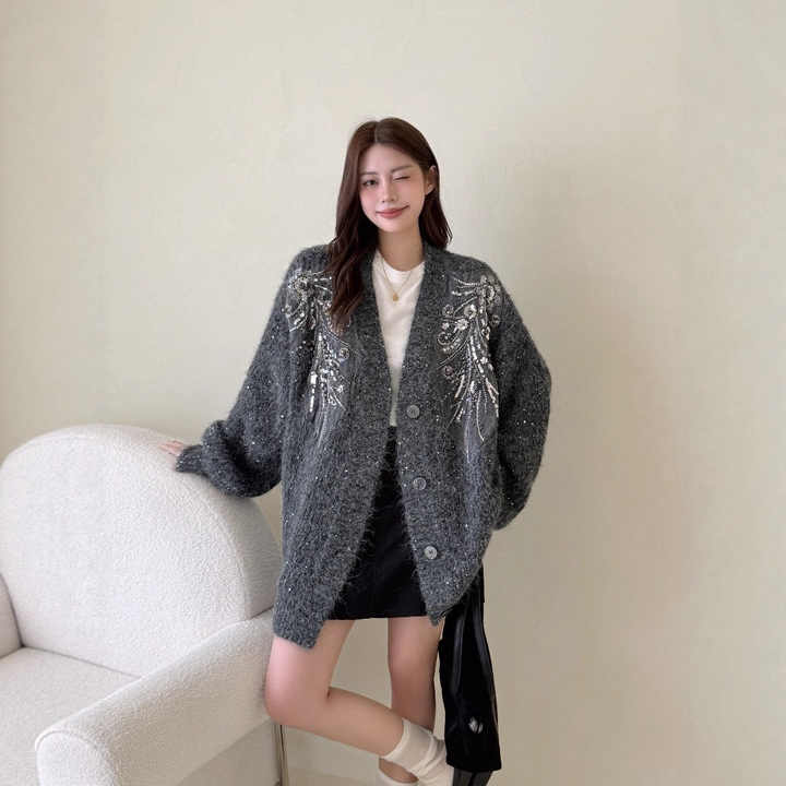 Maglione Autunnale da Donna Nuovo Stile Europeo-Americano con Ricami Pesanti di Paillettes e Perline, Motivo Animale in Stile Coreano, Scollo a V, Lunghezza Media