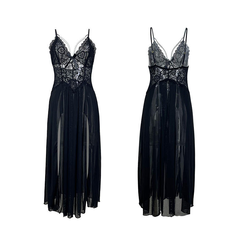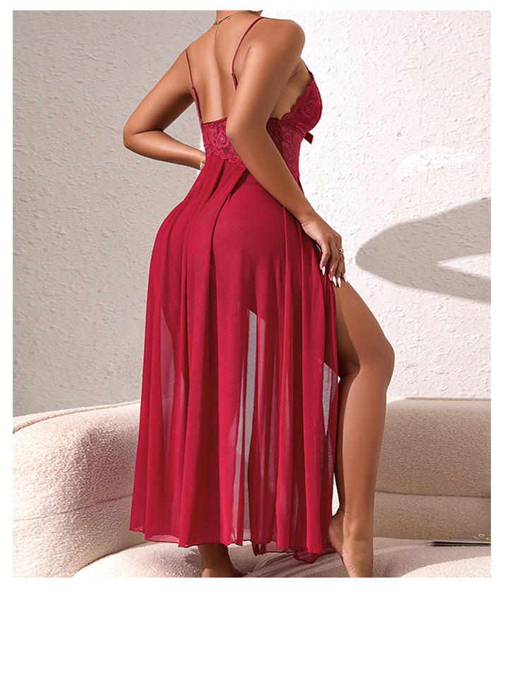 European American Style Sexy Lace Deep-V Nightgown Women's High-Slit Long See-Through Homewear Multi-Color