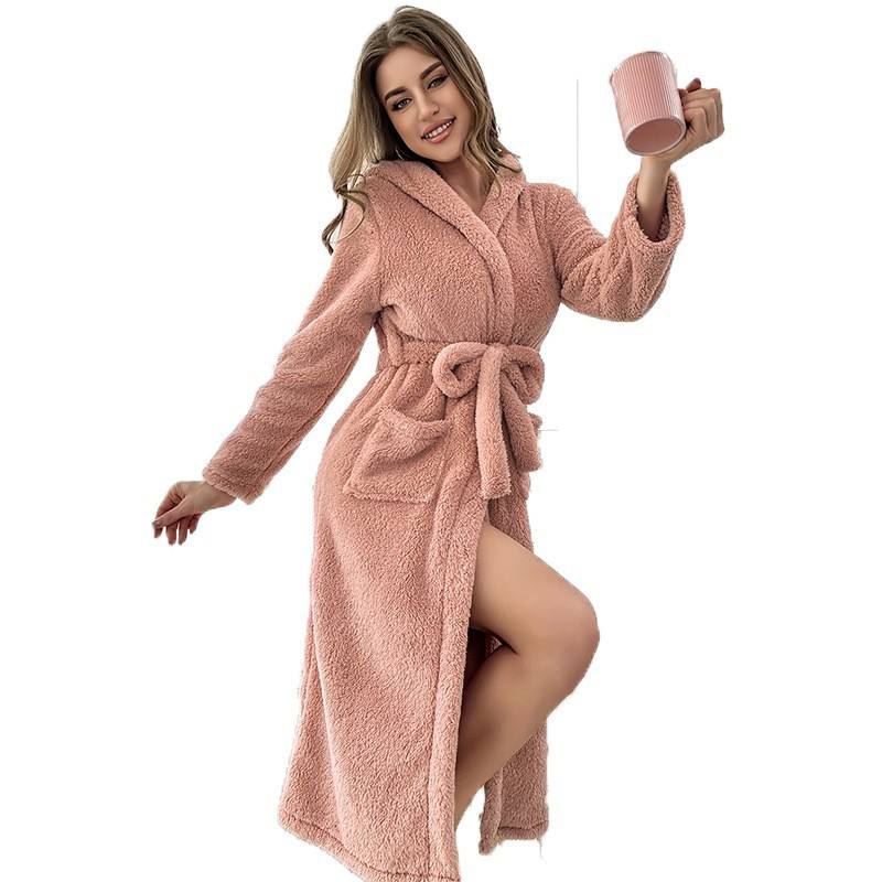 Stile europeo americano in tinta unita stile inverno rosa con cappuccio accappatoio cintura Casual corallo in pile pigiama per le donne vestiti per la casa